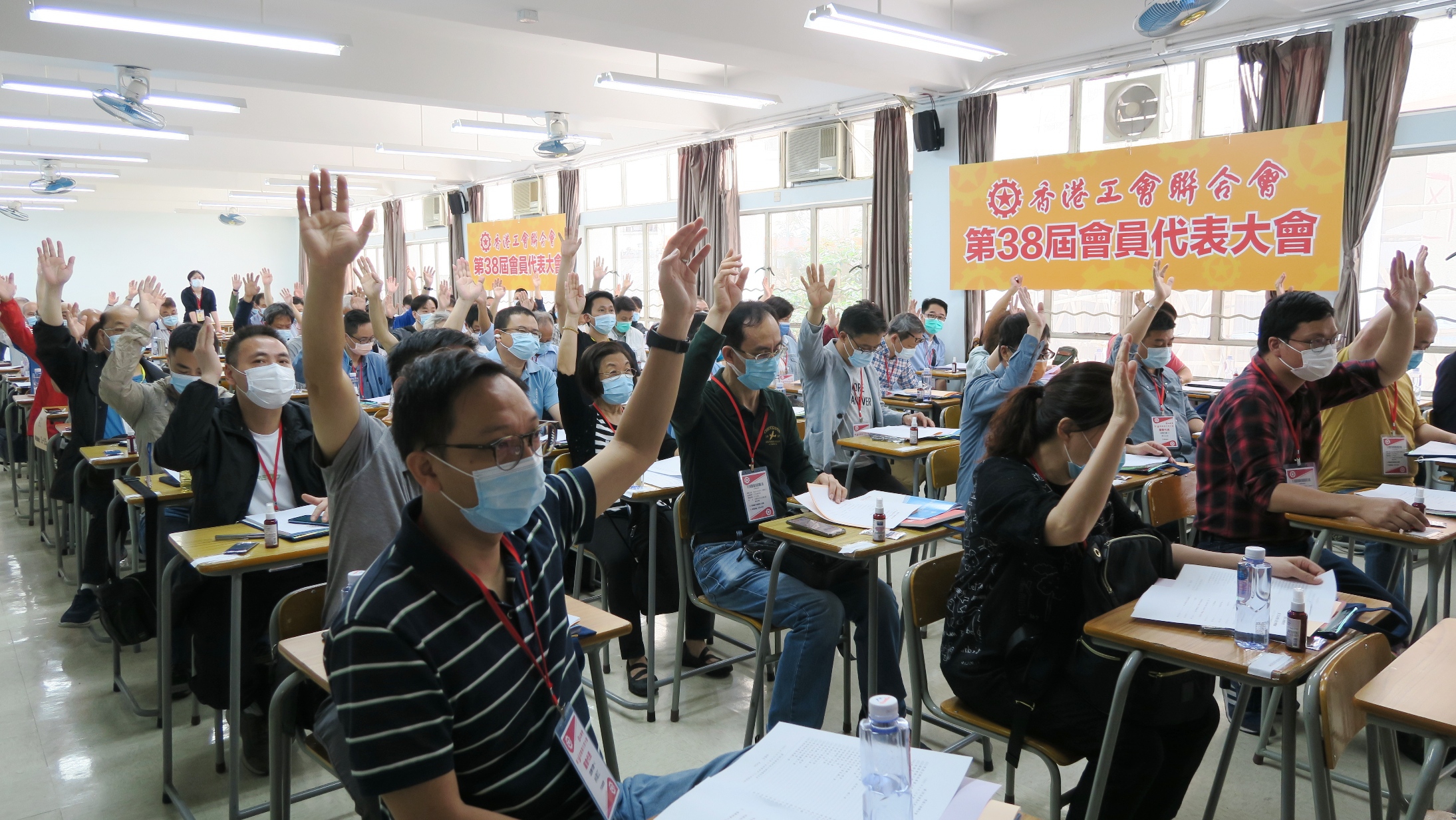 第38屆會員代表大會今天下午舉行,為謹慎防疫,所有進場代表均通過72小時內的病毒檢測。會議由全體人員肅立高唱國歌後開始,隨即由理事長黃國提交第37屆理事會工作報告。他在報告中指出,除了承接原定規劃的工作,也因應「黑暴」和疫情,推出了多項特殊的舉措和服務,包括在2020年向五千名工友發放每人3000元「緊急失業慰問金」;在工聯會職業發展服務處設立「口罩工場」,迄今免費送出了550萬個口罩助工友和有需要社群;承辦「支援內地港人寄藥行動」,合共舉辦78場,為三萬人次港人寄藥;去年11月發起「救失業 度時艱」關愛行動,在九龍、港島及新界舉辦了三場大型招聘會,提供三千個職位空缺;並開展「搵工話咁易」協助工友覓工作的服務等等。