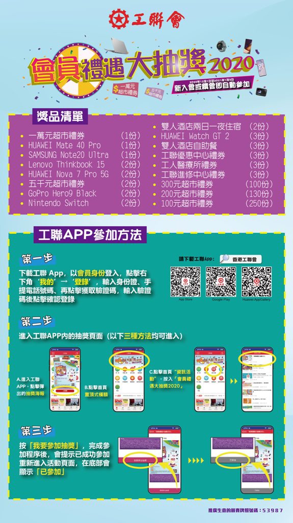 由即日起至2021年1月3日,工联会属会及贊助会会员只要登入工联APP或者扫描海报上的二维码就可以报名参加!于这段时间在各工会及服务点新入会或续会的会员,更无需报名则可自动参加!奖品丰富,切勿错过!请大家记得分享给身边的工友,预祝大家2021年第一个新年愿望迅速达成!