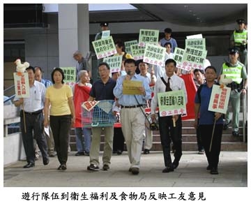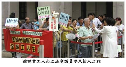 政府於7月2日向立法会提出「收回鸡档牌照计劃」,鸡鸭业职工会及工联会社会政策委员会就此於六月期间,分别约见食物环境衞生署署长梁永立、衞生福利及食物局局长杨永强,反映鸡档僱员心声。业界认为,自九七年香港爆发禽流感以後,业界一直致力改善鸡档的卫生环境并符合政府严格的衞生条件,包括加强清洁鸡档及为所有进口鸡隻注射疫苗。因此本年初亚洲区爆发的禽流感疫潮,本港的鸡隻一直没有受到感染。可惜的是,业界虽然在抗疫上取得如此卓越的成绩,但政府对於是否正常恢復活鸡供应的政策上仍然摇摆不定,导致四千多名鸡档僱员饱受五个月手停口停的局面,活鸡行业由於政府的犹豫不决而遭扼杀至死。