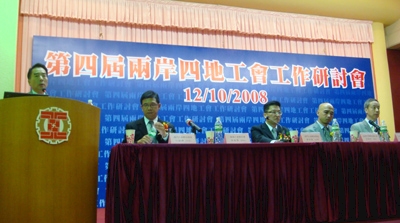 论坛由台湾、上海、香港和澳门四地工会连续第四年举办。上海市总工会民主管理部部长张立群就上海工会组织面临的形势与应对策略首先发言。接着是台湾中华联合总工会理事长任睦杉论述台湾工会的状