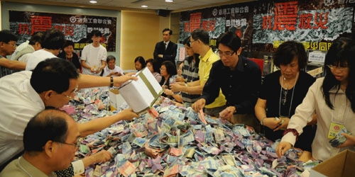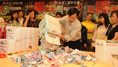 工联会理事长黄国健(右图)表示,街头筹款反应热烈,市民踊跃捐款。在执业会计师的监督下,点算出逾300万元港币捐款。工联会稍后会把这笔善款通过中联办,转交中国红十字会作赈灾用途。在地震发生翌日(5月13日),工联会及属会已即时向中联办递交55万元捐款,转交中国红十字会。