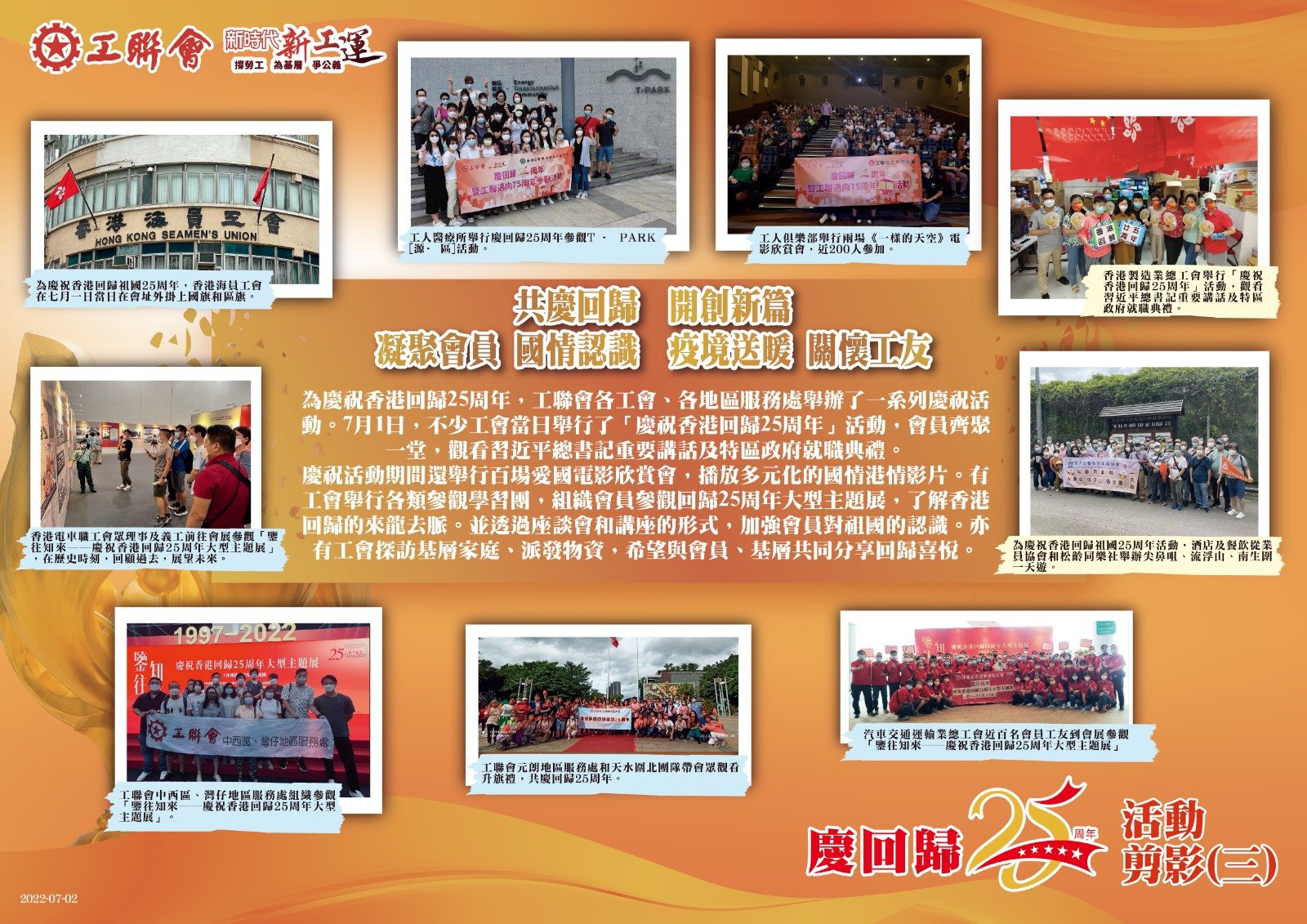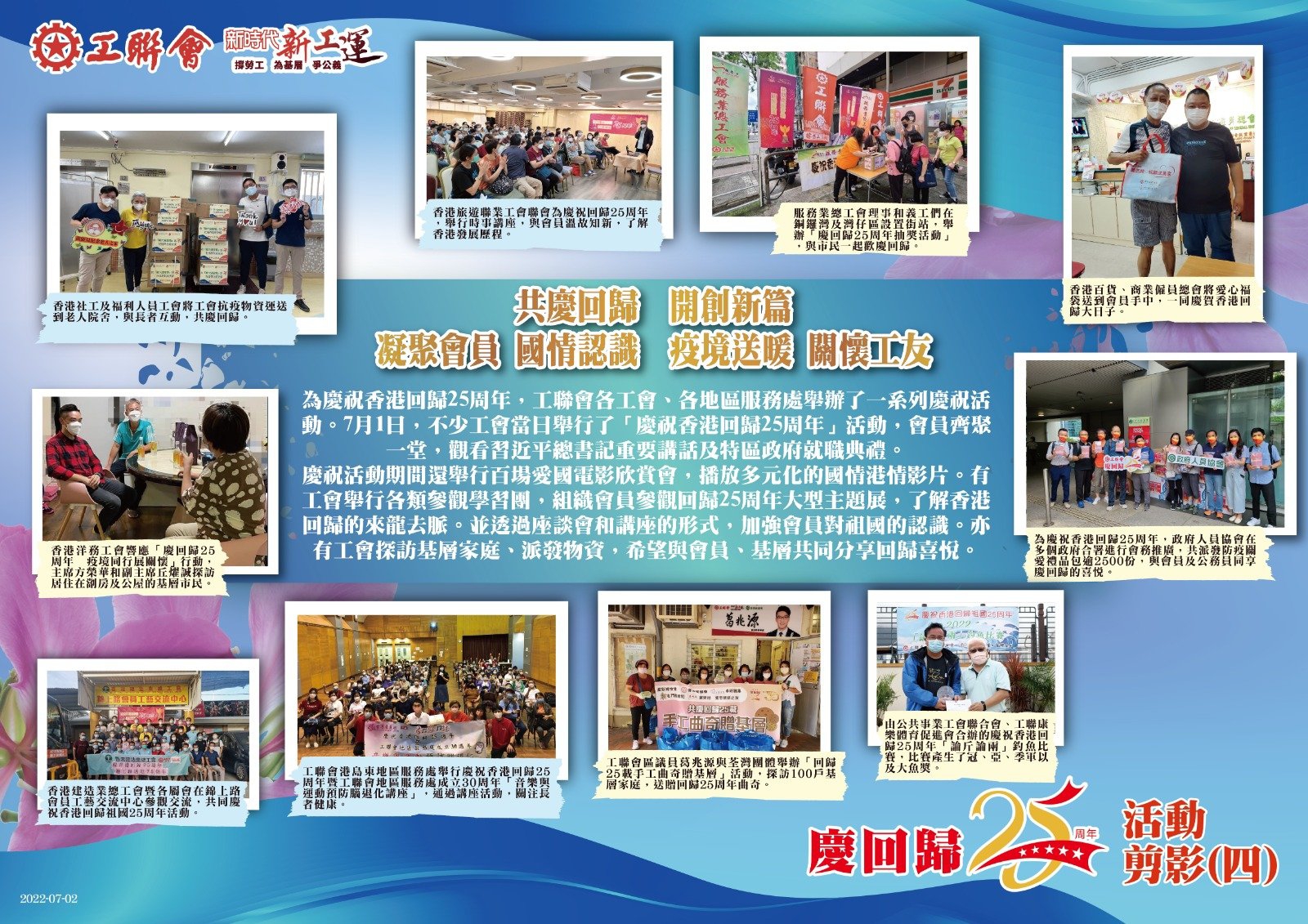 为庆祝香港回归25周年,工联会各工会、各地区服务处举办了一系列庆祝活动。7月1日,不少工会当日举行了「庆祝香港回归25周年」活动,会员齐聚一堂,观看习近平总书记重要讲话及特区政府就职典礼。