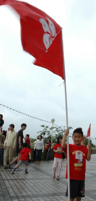今早本港持续下雨,雨势有时颇大,但无减穿上「中国加油」T恤或红衣的工联属会会员及家属前往打气的兴緻。他们无惧风雨,不停向城门河方向高举和挥动国旗、区旗,高唿「中国加油」和「支持北京奥运」等口号,部份人士更在场载歌载舞,欢迎圣火,气氛非常热烈。