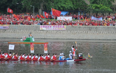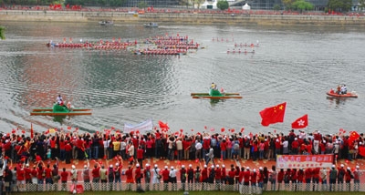 火炬手施幸馀在市民的见证及吶喊中接过火炬,运载着她的龙舟,顿成了打气者的焦点。当工联属会会员目睹奥运火炬传递的队伍经过时,现场立即沸腾起来,他们高唿「中国加油」,起劲地挥动手中的国旗、区旗,令现场变成一片旗海,支持者喜悦的心情及雀跃的表现,散溢着城门河两岸。
