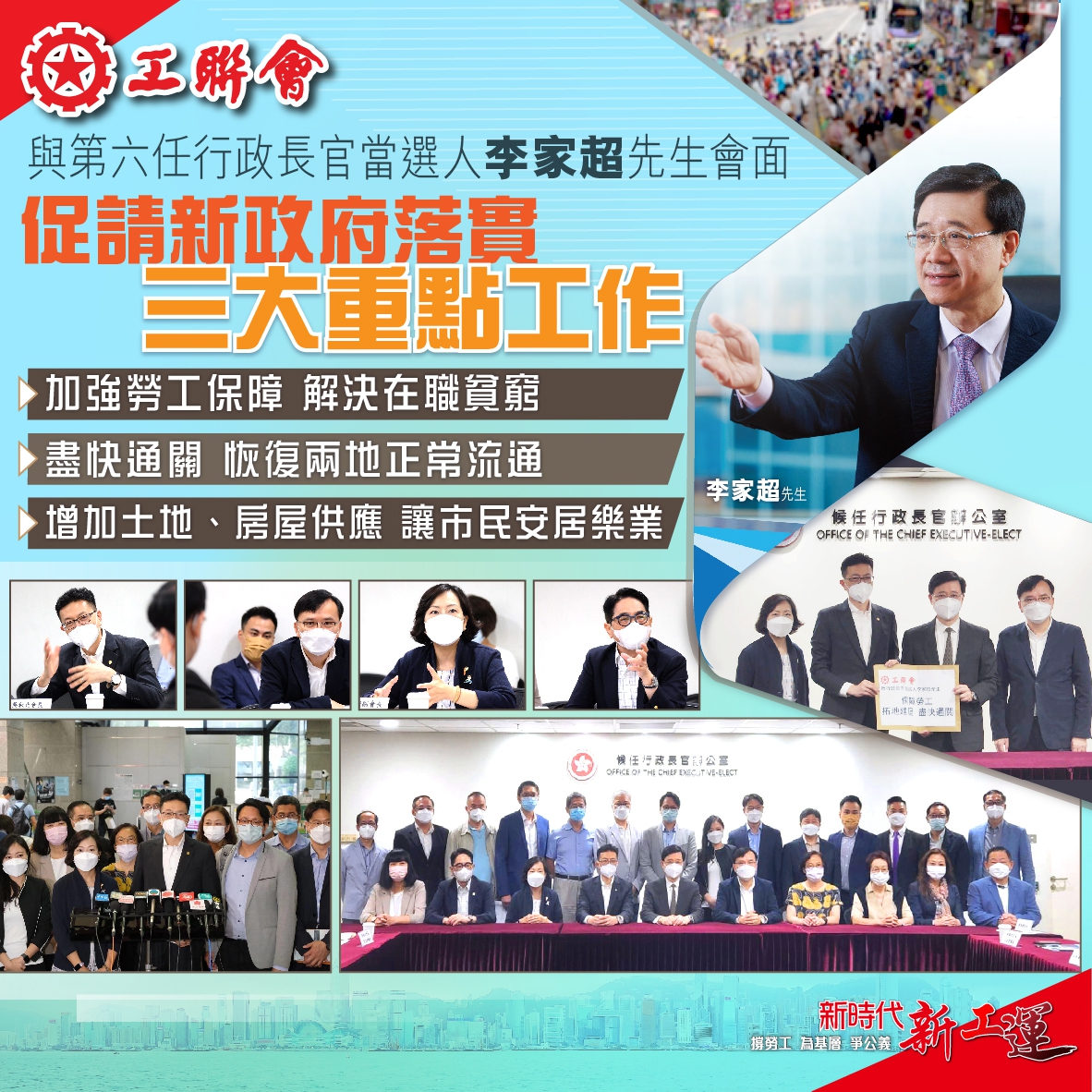 工联会更期望新一届政府能重点解决现时市民最关心的三大问题,一、加强劳工保障、解决在职贫穷,二、增加土地、房屋供应 让市民安居乐业,三、尽快通关 恢復两地正常流通等。下届政府施政应让港人都能真正分享经济发展的成果,从民生改善中重拾获得感、幸福感及安全感。