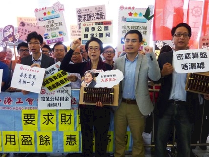 财政司司长曾俊华今天宣读2013-2014年度财政预算案,工联会社会事务委员会(社委)数十位成员,联同工联会立法会议员陈婉娴、邓家彪及郭伟强於立法会门外请愿,促请政府善用盈馀,推出惠民纾困的措施,并提出一系列诉求。 多名成员手持「密底算盘」道具,讽刺财政司司长「密底算盘唔漏罅」,经常「打错算盘」。例如上年度预算案估计,2012/13年的财政结馀为34亿元赤字。可是,政府今年1月31日公佈,政府财政盈馀达517亿元,相距甚大。 身兼社委副主任郭伟强表示,政府现时受惠於印花税及卖地收入,坐拥庞大盈馀,实有空间推行更多惠民措施,惟政府过去数年均过於惜财。工联会期望财政预算案能照顾基层市民需要,顺意民意,着力解决香港贫富悬殊问题。诉求包括: