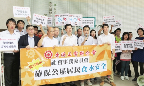 九龙湾启晴邨单位被验出食水含铅量超标,以致居民人心惶惶。工联会社会事务委员会(下称社委)成员今日到房屋署总部门外请愿,要求房署即时更换有问题的水龙头及喉管,并抽验全港公屋屋邨的喉管及食水样本,以确保公屋住户食水安全。