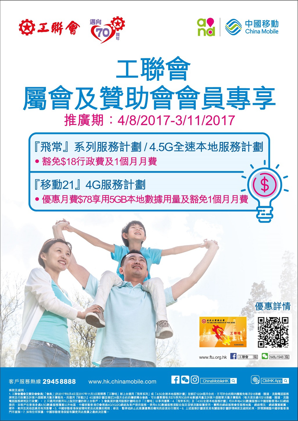 - 工联会属会及贊助会会员(「会员」)於2017年8月4日至2017年11月3日期间凭「工联咭」新客户及携号转台选用「飞常系列」或「4.5G全速本地服务计劃」并签订12/24个月合约,方可於合约期内获豁免每月$18港铁、隧道、流动电话服务牌照及行政费及於第六个账单月获月费豁免。而选用『移动21』4G服务计劃并签订24个月合约的携号转台会员,可以优惠价每月$78享用5GB本地数据用量及於第六个账单月获月费豁免(每月须另缴付$18港铁、隧道、流动电话服务牌照及行政费)。
