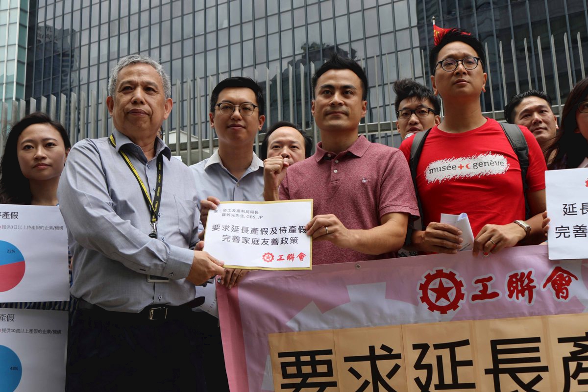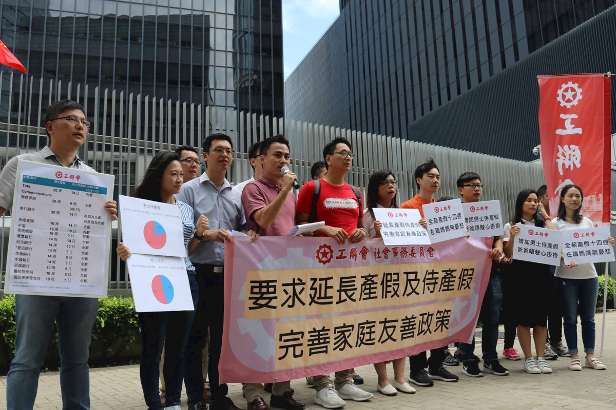 工联会社会事务委员会(下称社委)6月16日趁父亲节前夕到政府总部外请愿,并向政府代表递信,要求政府尽快增加男士侍产假,同时尽快落实全薪产假及延长产假至14週,以纾缓父母压力,促进家庭和谐及完善家庭友善政策。