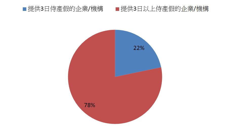 社委在2018年5月至6月份以电话及网上向54间本港的大型企业及机构作出查询,以了解这些企业及机构在男士侍产假和妇女产假方面的实施情况,结果收到23间企业及机构的回覆,发现大部份企业及机构已将侍产假及产假延长。在这23间企业及机构中,员工人数共约20万人,分别有七成八和五成二的企业及机构提供的侍产假及产假比法定的3日及10週为多。这些企业及机构提供的侍产假由3日至6週(42日)不等,产假则由10週至26週不等,当中通讯公司Tata Communications 及微软香港的福利较佳,Tata Communications 的有薪产假於去年已由10週增至26週、侍产假由3日升至14日,更可分两次休假,每次一星期;微软香港的员工则享有全薪产假20週、侍产假6週,侍产假比法例规定高出逾10倍之多。