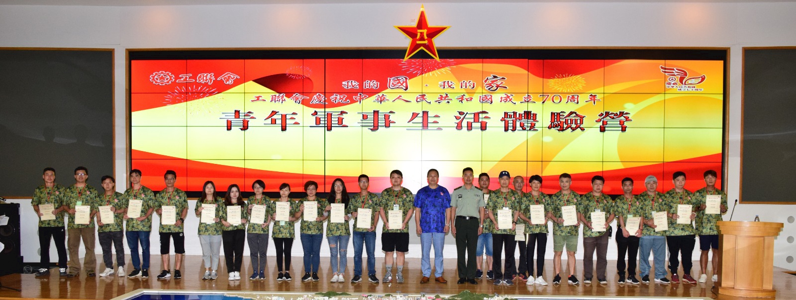 为庆祝中华人民共和国成立70周年,工联会举办「我的国.我的家」青年军事生活体验营。200名青年在一连两日的体验营中,透过丰富多彩的活动,磨练了意志,加深了对解放军驻港部队的认识,亦提升了作为中国人的归属感和自豪感。