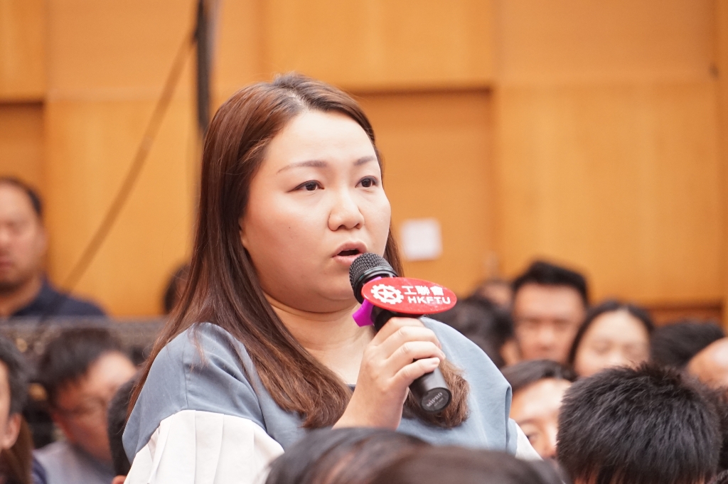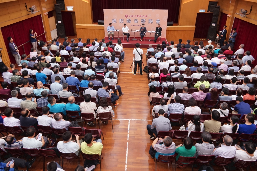 谘询会上约20人发言及提问,他们主要来自汽车、隧道、铁路、民航、公共服务、食环、旅遊、零售、酒店、建造及地区人士等。旅遊、建造、零售及食环等代表皆指出,因为受近期暴动事件影响,所属行业已大受打击,导遊开工率下跌至30%;建造工程拨款受影响,建造工人也开工不足、薪金受压;有食环署工友指出,工友不单工作量大增,人身安全也受影响,有同事日常执勤遭受侮辱,导致中风入院;零售业生意惨淡,试过整天「零发市」;也有与会者反映,现时政府外判制度不公平,同工不同酬,要求政府取消外判制度。