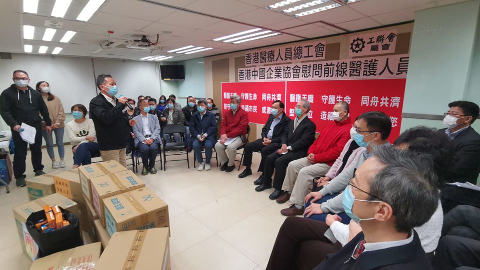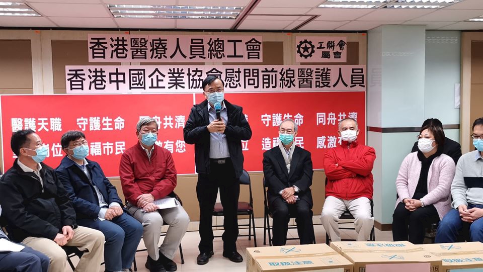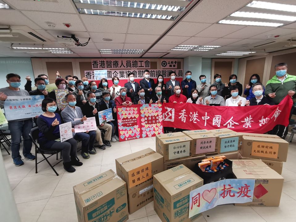 疫情无常!人间有情!香港中国企业协会今天(2月5日)傍晚带同慰问物资,来到工联会属会香港医疗人员总工会,为前线医护人员打气,希望他们在前线「打仗」,抗疫成功! 中企协执董、港区全国人大代表卢瑞安,招商局集团董事、港区全国人大代表李引泉联同10位来自多家中资企业的代表,送来1万个口罩、2千盒夏桑菊沖剂、维生素C近4百盒等等多种打气物资和满满的心意,由工联会理事长黄国及副理事长马志成、医总主席潘佩璆医生及副主席冯权国等接受。工联会及医总都表示由衷感谢,并将向前线医护人员及会员发送。 卢瑞安表示:「自疫情发生以来,香港各界积极行动,共同防护疫情蔓延,广大医护人员以市民健康为福祉,坚守岗位、无私奉献,为香港抗疫默默耕耘」。他指出,香港医疗人员总工会团结各医疗行业员工,秉承救危扶困的职业操守,向业界发出坚守岗位、同心协力、共渡难关的唿吁。在全城口罩短缺的情况下,捐出1万口罩个是为坚守岗位的医护表达关心和支援,他们在前线战鬥值得敬重,希望抗疫成功! 工联会理事长黄国表示:「香港医疗人员总工会有万多名医护人员,他们在前线默默守护香港市民健康、守护紧香港人生命,这时正需要更多鼓励及打气。」 中企代表与医护代表亦举行座谈,以了解医护人员的辛酸困难。多名前线医护人员及工会代表皆表达了他们在前线抗疫的感受,支援职系员工黄垚铨女士指出:「在罢工开始时,有同事向主管表示,如果有同事罢工,我愿意取消我的假期去上班,这事令大家很感动。」 医院管理局支援职系员工协会理事长吴伟玲亦分享说:「这两天,心脏科整组同事及院方也很担心,因为若在这段期间紧急病人要送过来(做手术),如果因为这些事(罢工)做成人命伤亡,是绝对唔值得。我觉得大家要团结,为市民服务。」香港机构医生协会主席黄耀明医生则希望传媒多报导有返工的同事心声,我们的心声是「大家可尽快full team(完整团队)返工。」 除了捐赠多箱物资外,各中资企业亦带来慰问心意卡致送给10医院(包括广华医院、伊利沙伯医院、东区尤德夫人那打素医院、玛丽医院、九龙医院、基督教联合医院、玛嘉烈医院、仁济医院、威尔斯亲王医院、屯门医院)的医护人员,让前线医护人员感受到大家的关怀,而且并不孤单。有关中资企业则包括:中旅集团、招商局集团、华润集团、中银香港、太平保险集团、粤海集团公司、工银亚洲、交通银行香港、光大集团香港、中企协会。 香港医疗人员总工会主席潘佩璆医生表示:「这两天见到,新确诊个案及疑似个案增加,但治癒人数亦不断增加,超越了死亡数字,反映是一个好发展,我好有信心,我们国家,我们同胞一定可以克服这一场疫症。」 工联会副理事长、政府人员协会主席马志成先生相信「凭着大家专业知识及高尚情操,为左家人为左香港为左国家,守住这一条防线,尽快令香港重回正轨。」 有关香港中国企业协会到香港医疗人员总工会打气情况,可看视频: