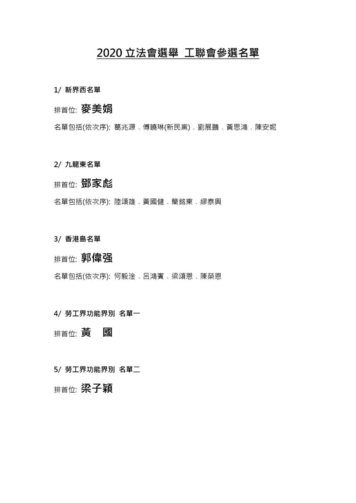 香港岛名单则以郭伟强为名单首位,与何毅淦、吕鸿宾、梁颂恩与陈荣恩合组名单。郭伟强名单以「我敢,我上」为竞选口号。郭伟强表示,工联会立足香港72 年,与香港人「同唿吸,共命运」,陪伴勤勤恳恳的香港人一起走过高高低低——从力争男士侍产假、延长14 周产假到落实广东计划等,工联会一步一脚印的为打工仔女争取权益。郭伟强指出,九月立法会一战,若「揽炒派」图谋得逞,香港将陷入施政停摆、经济崩溃的万劫之地;是故勉励工联会一众同道,要敢于担当,迎难而上,一同守护香港。