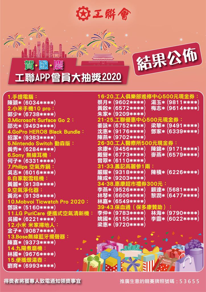 2020-10-07 「贺国庆 工联APP」会员大抽奖2020_结果公佈