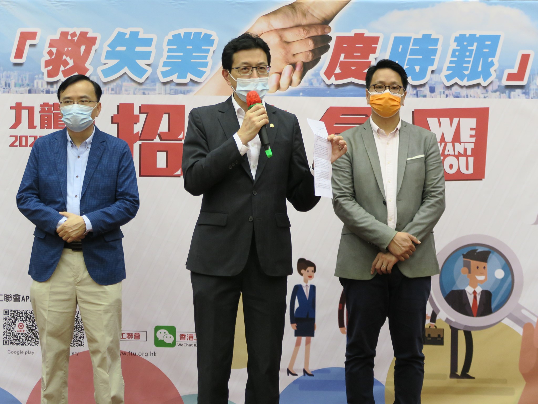 吴秋北致辞时表示,去年的「黑暴」加上今年的新冠肺炎,香港社会遭受前所未有的打击,倒闭潮一波接一波,不少打工仔女的饭碗朝不保夕,最新失业率仍处6.4%高位,失业人数超过25万,尤其青少年失业问题严重。过去一段时间,工联会推出多项抗击疫情的行动,率先设立本港首间民间口罩工场,「只送不卖」向有需要人士免费提供口罩,又承香港特区政府委託,迅速推出「寄药服务」支援两地港人,到3月推出「紧急失业慰问金」计划,向社会各界募捐,在短短一个月内向5000名失业人士每人发放3000元慰问金,以解燃眉之急。但是,面对当前经济疲弱的形势,如何直接纾缓失业人士及家庭的困境?就是一份工作!