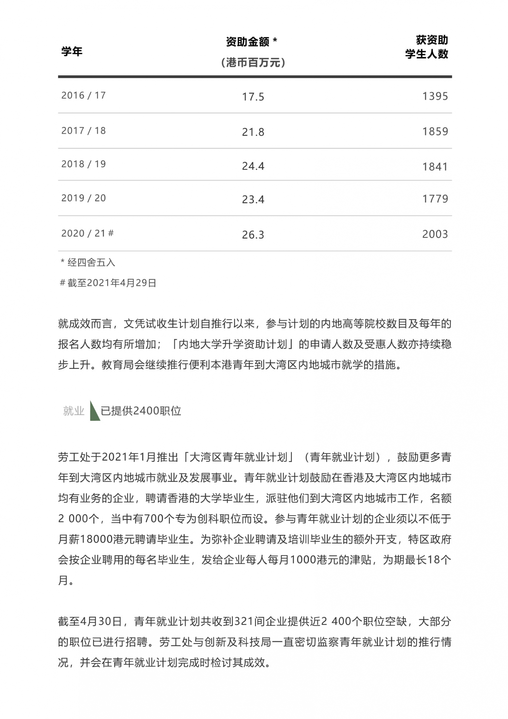 此外,教育局自2014/15学年起透过「内地大学升学资助计画」,为有意到内地升学的本港高中毕业生提供资助。资助计划包括两部份—「经入息审查资助」(通过入息审查的学生视乎需要可获全额资助或半额资助)及「免入息审查资助」。在2020/21学年,「经入息审查资助」下的全额及半额资助分別为每年港币16800元及8400元;「免入息审查资助」下的定额资助则为每年港币5600元。过去五个学年,「内地大学升学资助计划」涉及大湾区内地城市(包括广州、深圳及珠海)的资助金额及获资助学生人数如下: