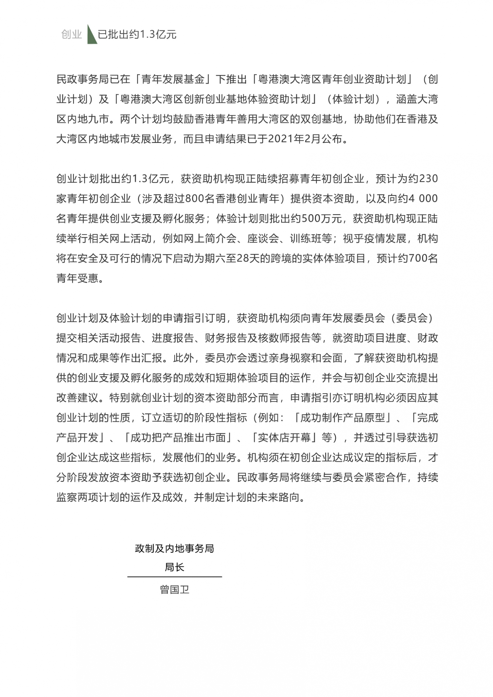 创业计划批出约1.3亿元,获资助机构现正陆续招募青年初创企业,预计为约230家青年初创企业(涉及超过800名香港创业青年)提供资本资助,以及向约4,000名青年提供创业支援及孵化服务;体验计划则批出约500万元,获资助机构现正陆续举行相关网上活动,例如网上简介会、座谈会、训练班等;视乎疫情发展,机构将在安全及可行的情况下启动为期六至28天的跨境的实体体验专案,预计约700名青年受惠。