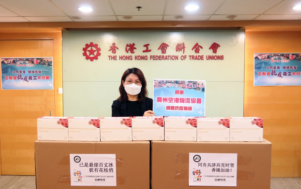 为支援「工联会抗疫义工大行动」,广州空港物流协会捐赠一批快速检测盒予香港工会联合会(工联会)和前缐工友,希望大家能做好防护工作,齐心对抗香港第五波疫情。 工联会副理事长曾志文非常感谢广州空港物流协会对香港疫情和前缐工友的关心,她说,工联会会将这批抗疫物资透过各工会、地区服务、福利服务机构和议员办事处等转送给前缐工友。 工联会作为一间爱国爱港的工会组织,每当香港经歷困难时刻的时候都会挺身而出,与香港市民一度共度时艰,相信今次在中央、内地机构和香港社会各界的支持和团结下,香港一定能够成功抗击第五波疫情。 工联会发起及组织「工联会抗疫义工大行动」,积极参与各项防疫抗疫工作,希望尽快打赢疫战,恢復社会正常生活状况。![]()
