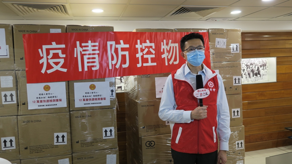 工联会会长、立法会议员吴秋北今日(2月20日)接收福建省总工会捐赠总值80万元抗疫物资支援香港工联会和前缐工友的抗疫。当香港爆发第五波新冠肺炎时,疫情日趋严峻,工联会迅速发起及组织「工联会抗疫义工大行动」,积极参与各项防疫抗疫工作。香港疫情引起福建省总工会的关注,即时捐赠快速检测套装等应急物资,支持「工联会抗疫义工大行动」希望透过工联会转发给前缐工友及有需要的基层市民,期望大家团结一致,齐心抗疫。 「闽港工会同心,香港加油!福建撑您!」闽港两地工会交流密切,当福建省总工会得悉香港第五波疫情严峻爆发时,即时伸出援手,捐赠12万7千套快速检测套装。吴秋北非常感谢福建省总工会的支援,发挥「一方有难,八方支援」精神。工联会收到这些抗疫物资后会第一时间透过各工会、地区服务处、议员办事处及服务机构转交给前缐工友和有需要会员手上。 吴秋北表示,现时工友对快速检测套装的需求殷切,主要是市面供面不足,福建省总工会这些抗疫物资能帮助工友在开工前做好检测工作,齐心抗疫。而这些物资代表福建对香港的祝福和爱,相信闽港福建乡亲团结一致下,香港定能很快战胜疫情,回復正常生活。 吴秋北也感谢中央政府、内地工会,社会各界及时支援。他说,工联会作为一间爱国爱港的工会组织,每当香港经歷困难时刻的时候都会挺身而出,与香港市民一度共度时艰,相信香港一定能够成功抗击第五波疫情,尽快清零。