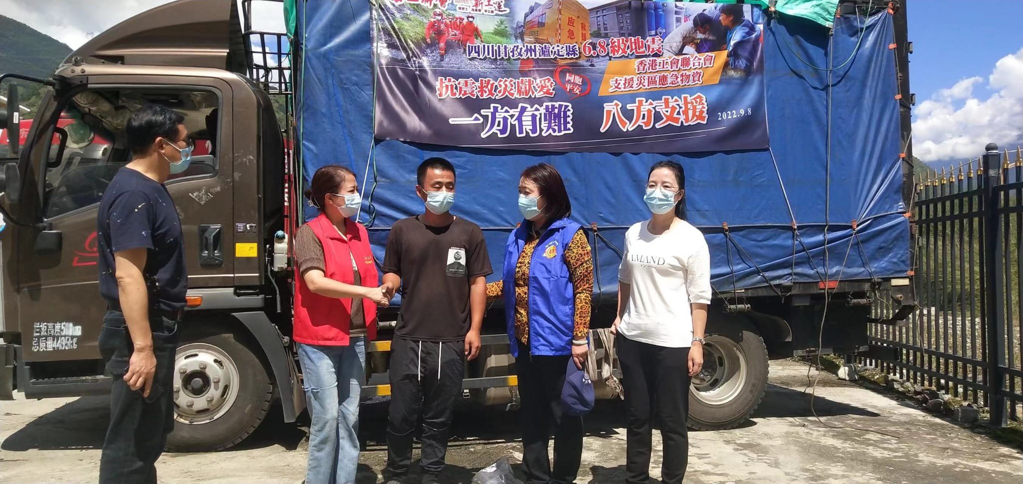 救灾物资中午送抵灾区,由当地工会、红十字会代表接收,他们非常感谢香港市民对灾区的关心,特別是在中秋节及时送上灾区市民急需物资,更有特殊意义!