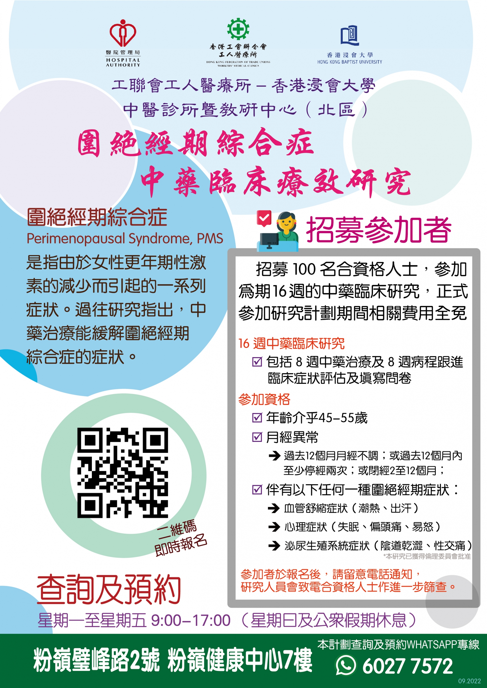 工联会工人医疗所 – 香港浸会大学中医诊所暨教研中心(北区)举办「围绝经期综合症中药临床疗效研究」。