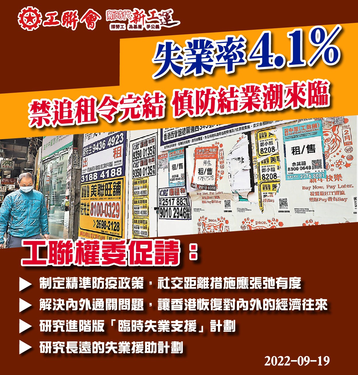 政府统计处9月19日公布最新失业率为4.1%,共有16.1万名失业人士,失业率连续四个月回落。工联会权益委员会(下称「工联权委」)认为近期失业率虽回落,但政府不应为此而掉以轻心,尤其是暂缓追租安排(禁追租令)结束后,结业潮有涌现的迹象。故此,促请政府儘快研究救市措施以备不时之需;同时,希望特区政府适时调整防疫政策,令各行各业得以復甦。