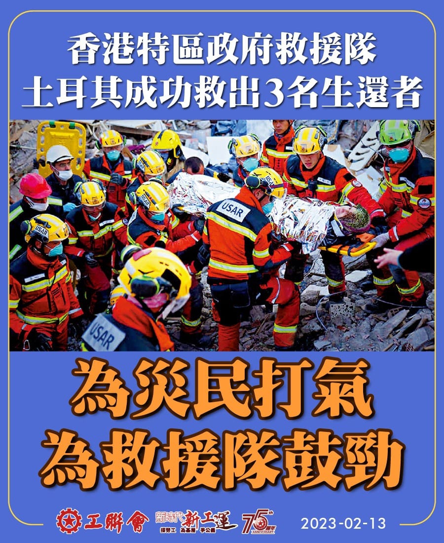 全球各地均派出救援队伍抵达土耳其搜救灾民,国家队和香港救援队到达灾区后争分夺秒执行搜救行动,成功救出多名生还者,特別是香港救援队成功救出三名生还者的消息传来时,令人感动及振奋。工联会将密切留意情况,适时提供援助,吴秋北说︰「万众一心必能战胜天灾,工联会祝愿土耳其地震灾民平安!为香港救援队加油!」