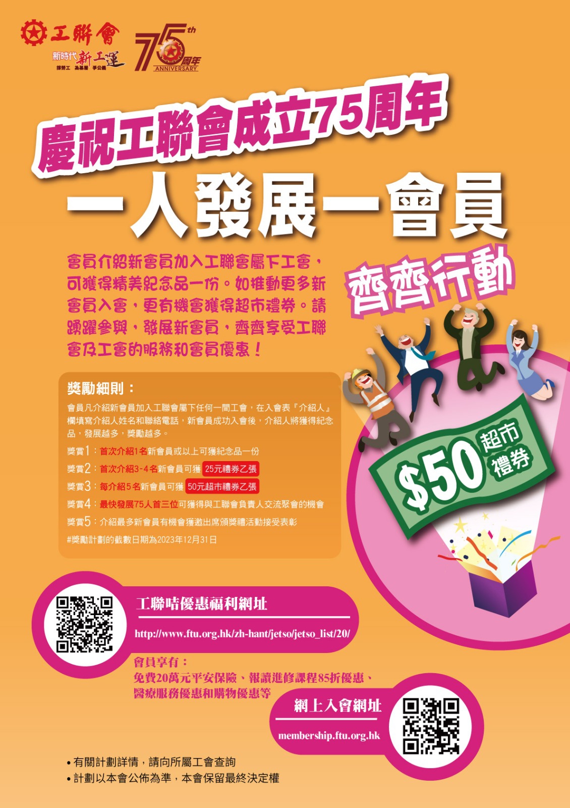各位工会会员或义工,今年凡成功介绍市民加入成为工联属下工会之会员,均可获赠精美纪念品,更有机会获赠现金券,发展越多,奖励越多。 踊跃参与,与亲友一齐加入工会,共同享受工联及工会的服务和会员优惠! 欢迎透过网上入会专页加入工会:https://membership.ftu.org.hk/zh-hant/