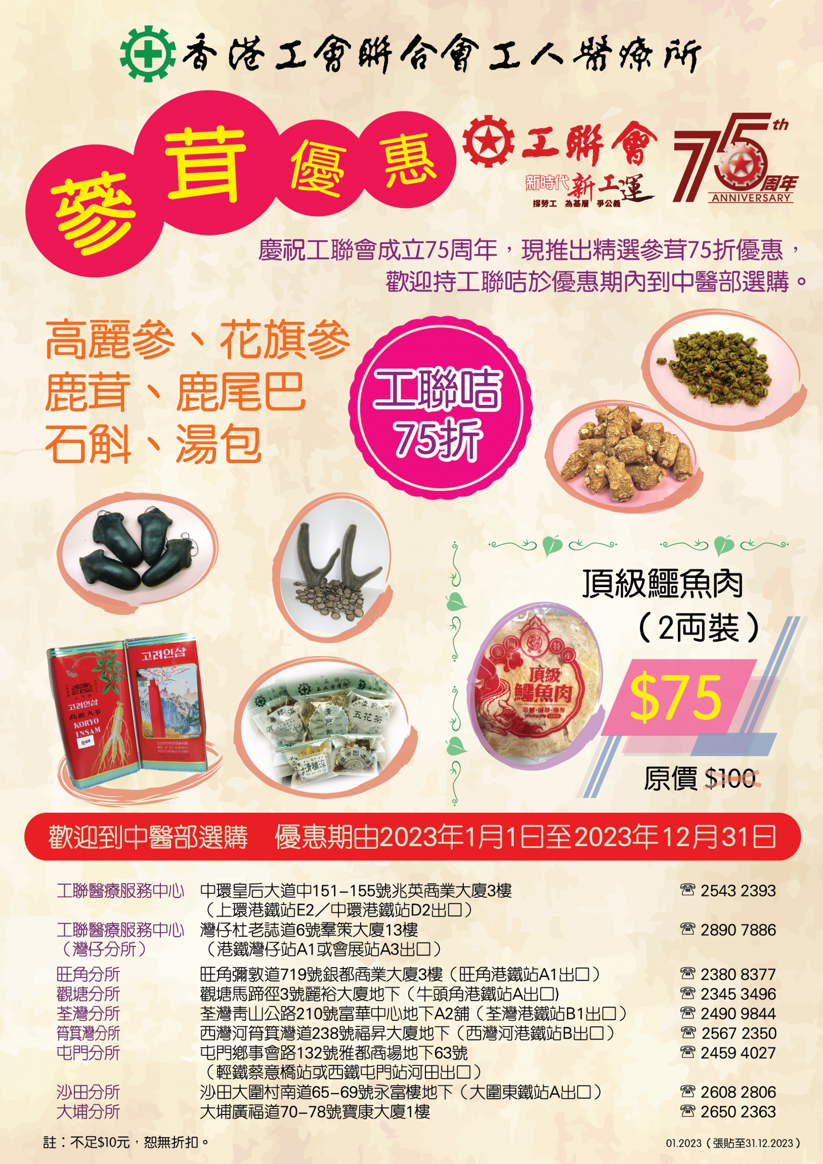 - 购买高丽参、花旗参、鹿茸、鹿尾巴及石斛等5类指定参茸药材,可享75折优惠