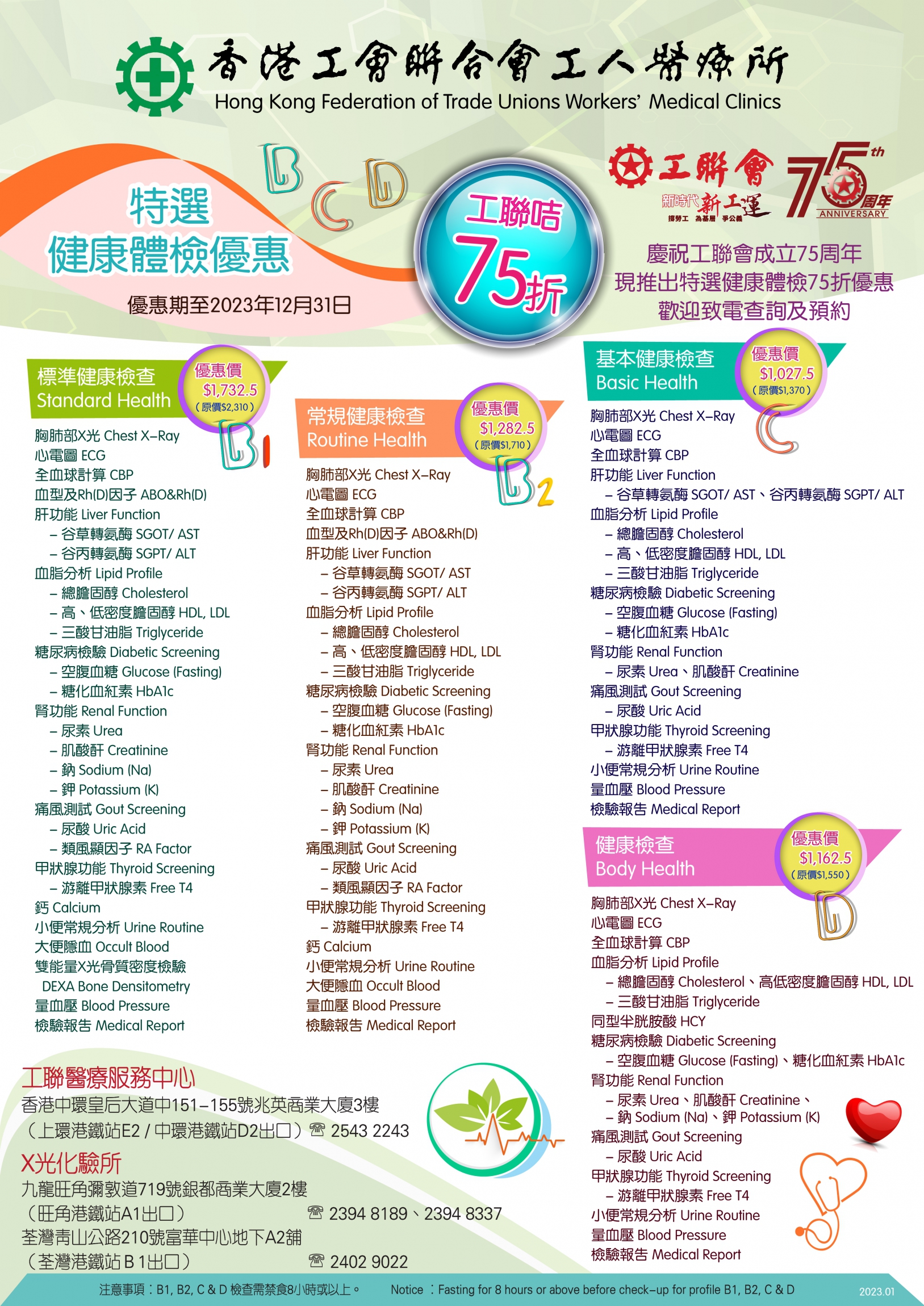 - 特选4项健康检查计划,包括:B1 标准健康检查、B2 常规健康检查、C 基本健康检查 及 D 健康检查,可享原价75折优惠(计划详情可按 此网址)