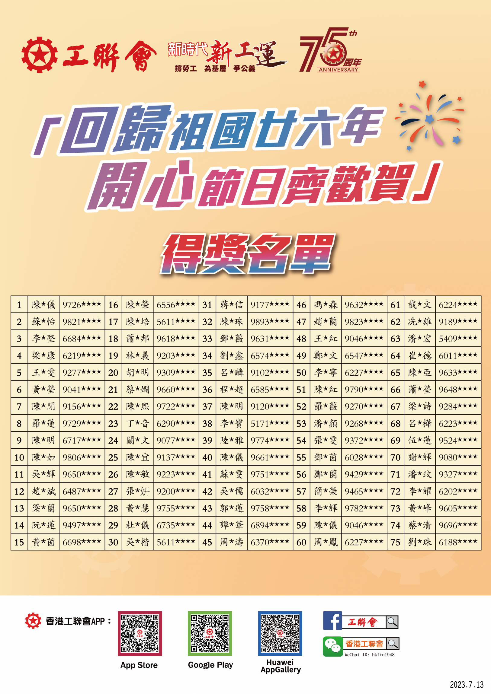 香港回归祖国26周年,适逢工联会成立75周年。工联会于6月30日至7月2日推出的「回归祖国廿六年 开心节日齐欢贺」工联APP有奖问答游戏经已圆满结束。 得奖名单如下,恭喜所有得奖者可获$50超市礼券,并多谢大家踊跃参与! 註:得奖者稍后会有专人联络领奖,如有查询,请致电:3652 5700
