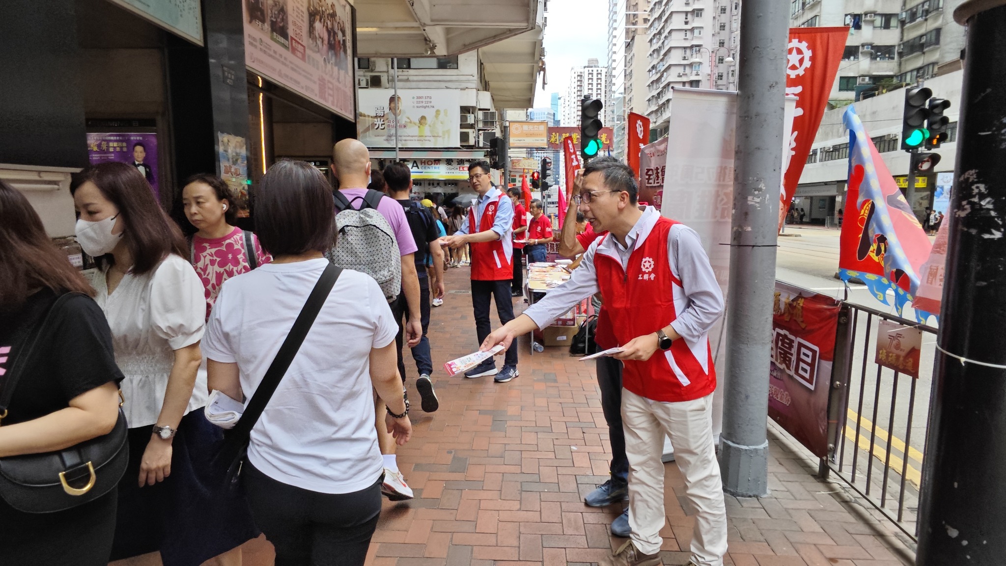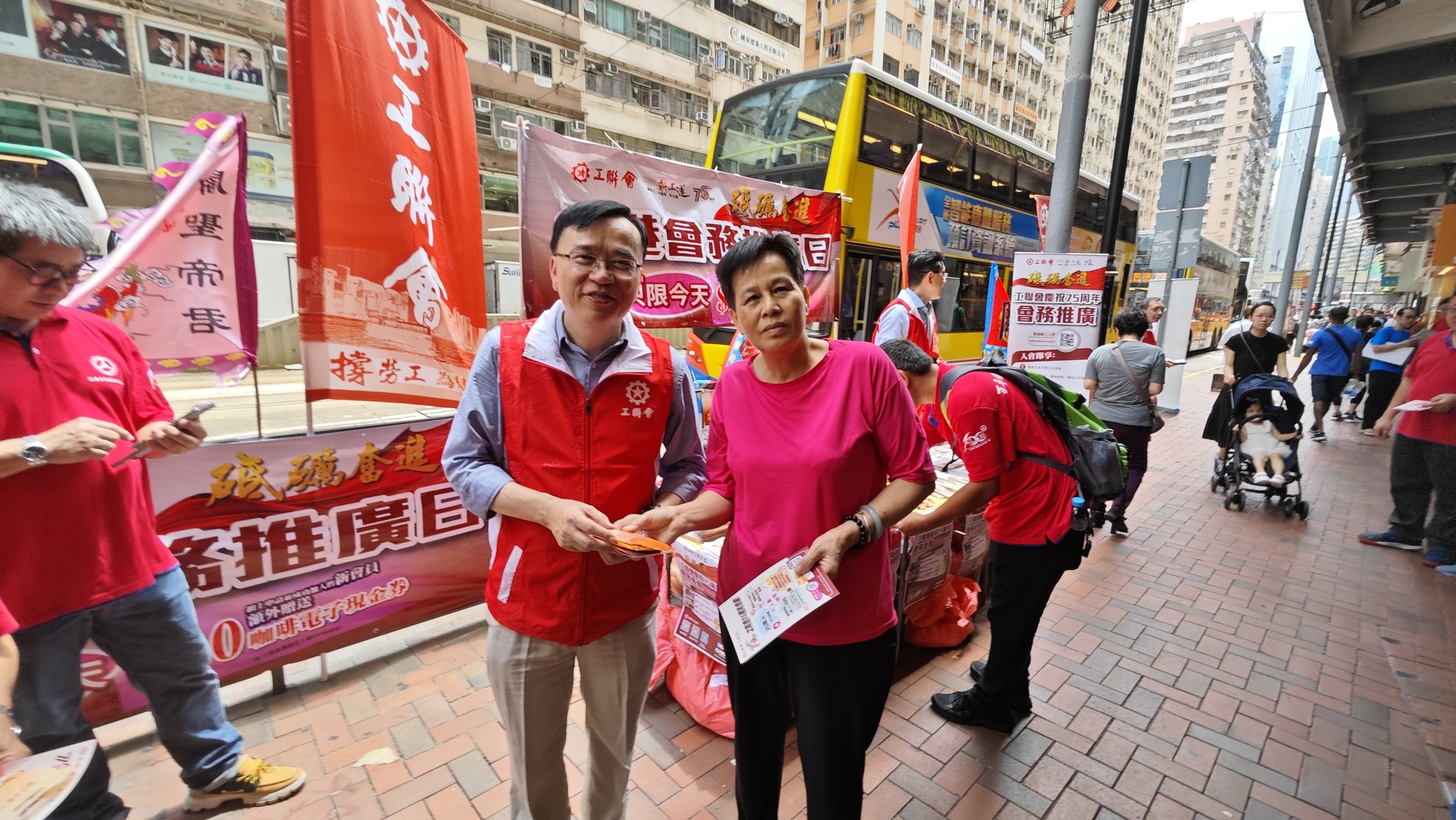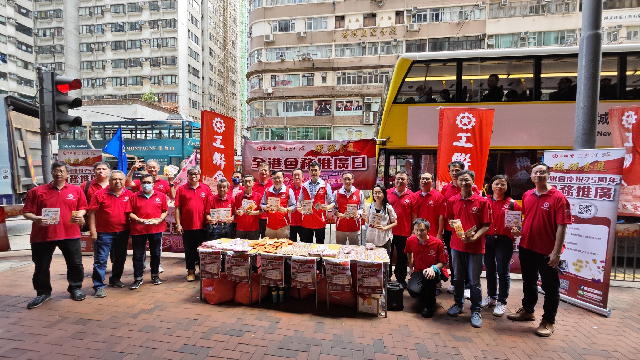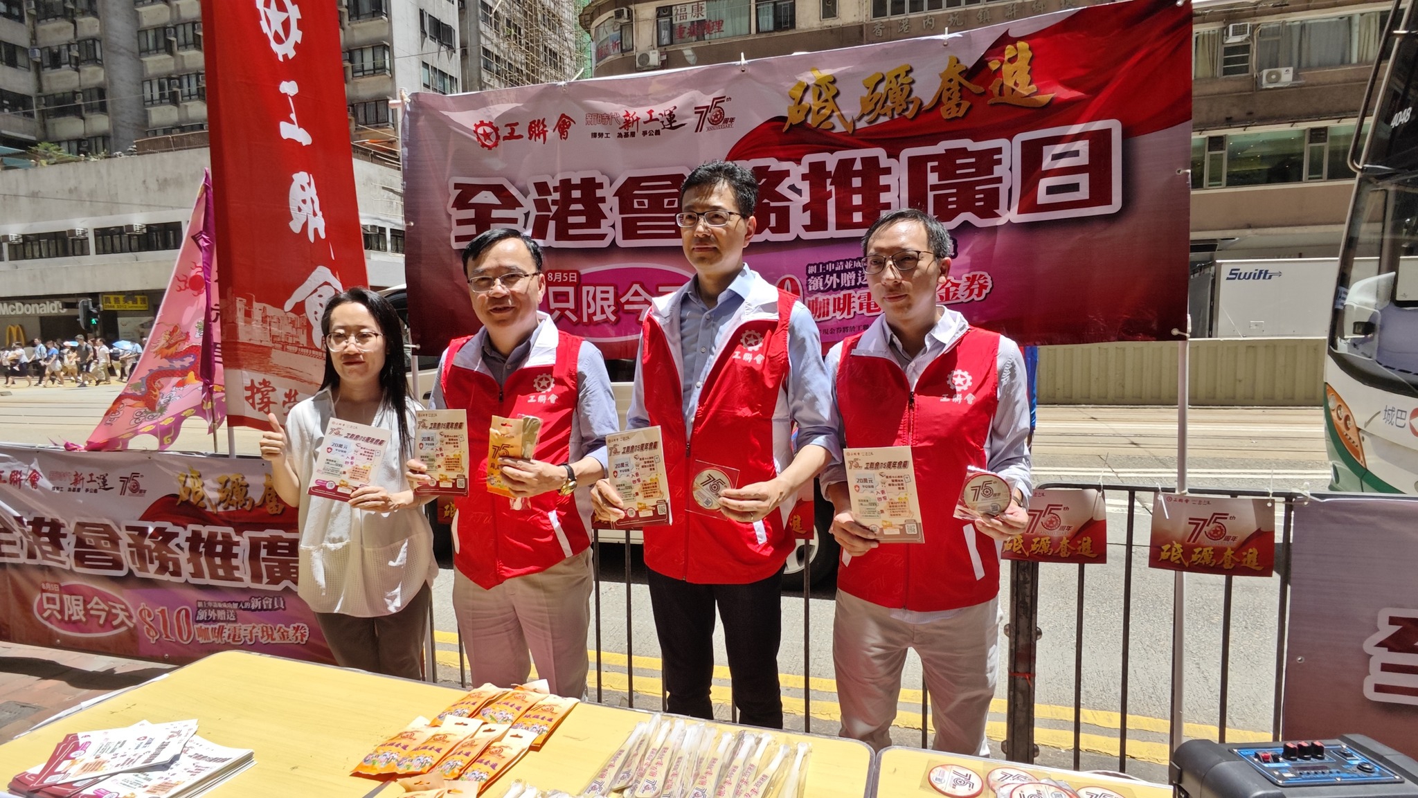 为庆祝工联会成立75周年,工联会今日(8月5日)举行全港会务推广日,分別在港九新界设立75个街站进行宣传,让市民进一步了解工联会的各项服务。工联会会长吴秋北,理事长黄国,副理事长林伟江及秘书长马光如等出席会务推广日启动礼,并向市民派发宣传单张,唿吁市民加入工会,团结起来,更好维护合法权益。