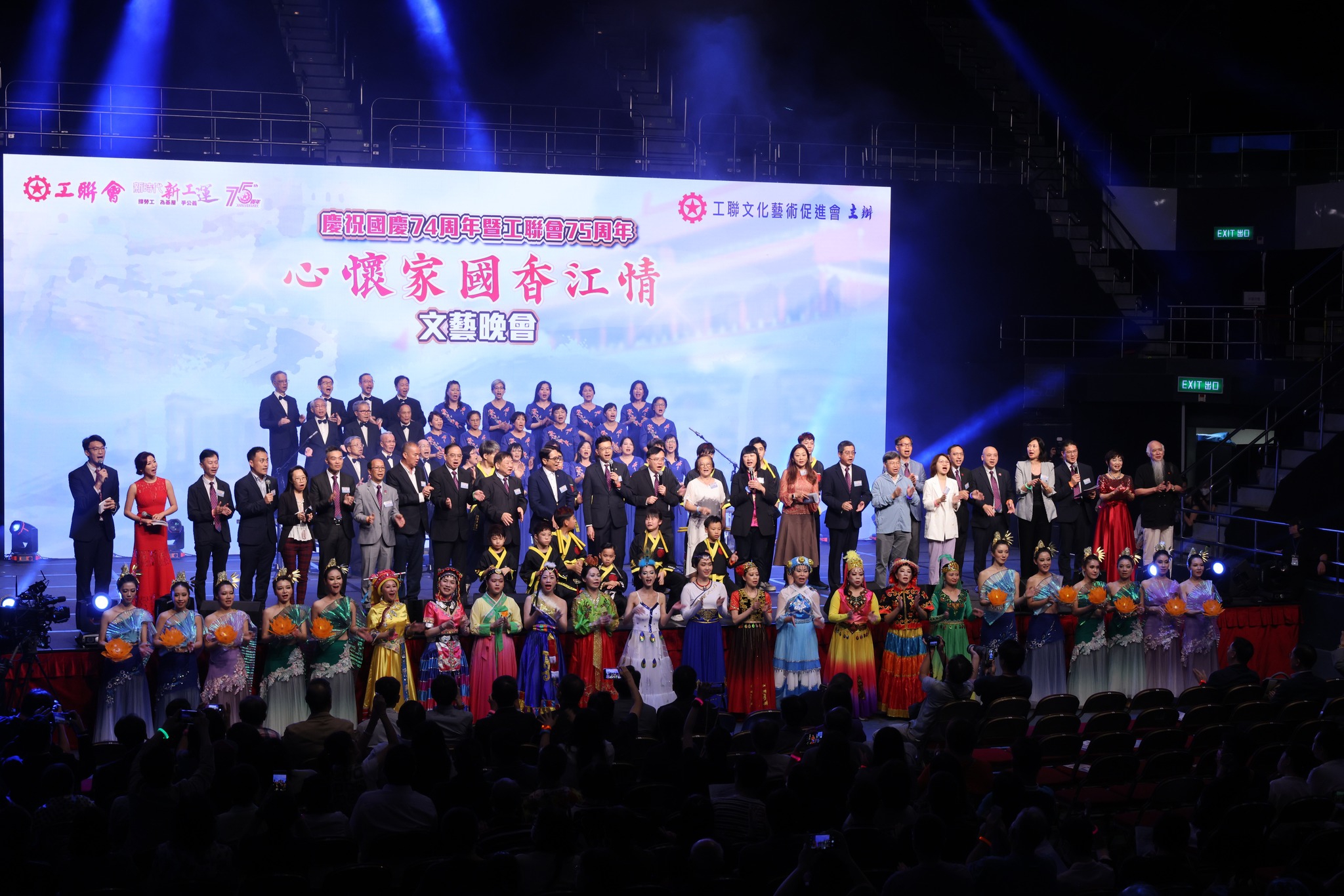 为庆祝国庆74周年暨工联会成立75周年,工联会昨晚(9月17日)假座香港湾仔伊利沙伯体育馆举办疫情后首个大型文艺表演:《心怀家国香江情》文艺晚会,一众优秀表演者带来丰富的节目,包括艺人演唱、步操乐队、乐器演奏、舞蹈、功夫杂技、青少年粤剧等等,表演非常精彩,令台下逾2000多名会友、市民热烈欢唿。