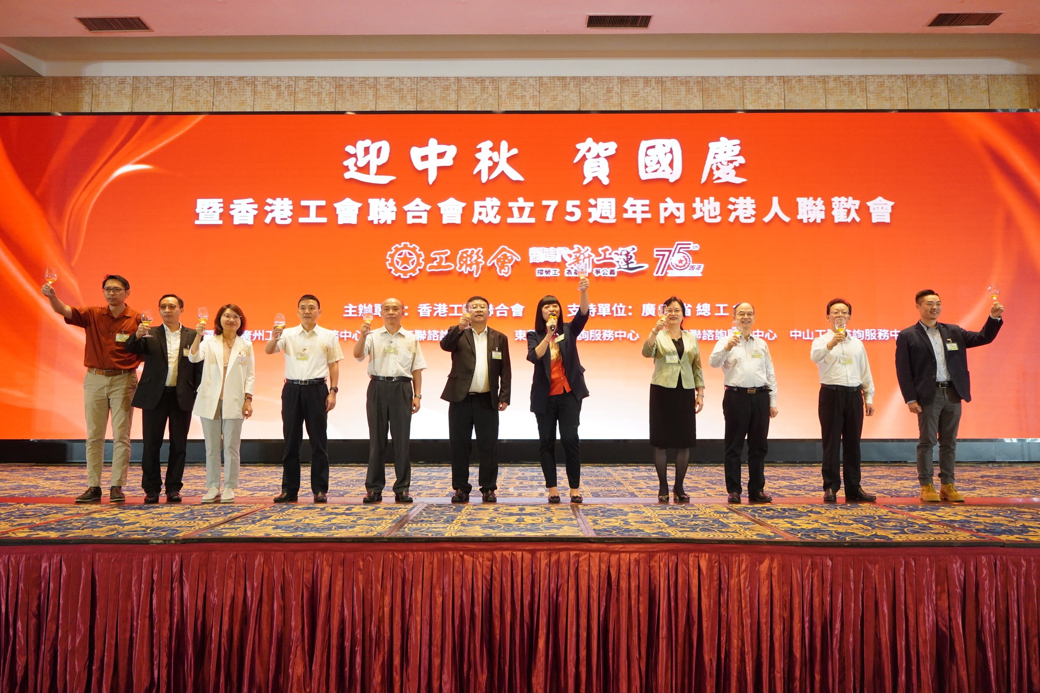 9月27日,由香港工会联合会主办,广东省总工会支持下,假座广州东方宾馆举行「迎中秋贺国庆暨香港工会联合会成立75周年内地港人联欢会」,工联会副会长谢爱红,副理事长曾志文、林伟江和丘燿诚等出席,与近550名来自大湾区城市及福建的内地港人朋友同聚一堂,一齐庆贺国庆以及迎接中秋佳节。