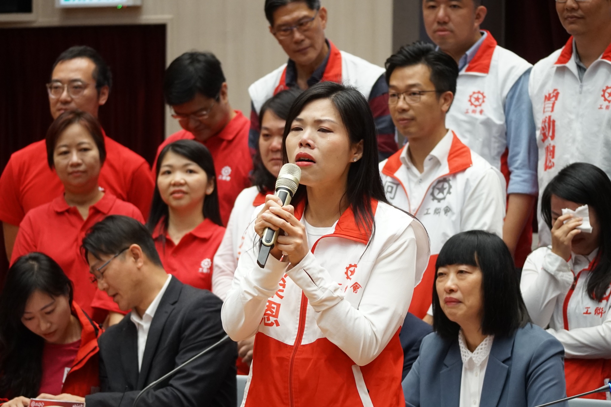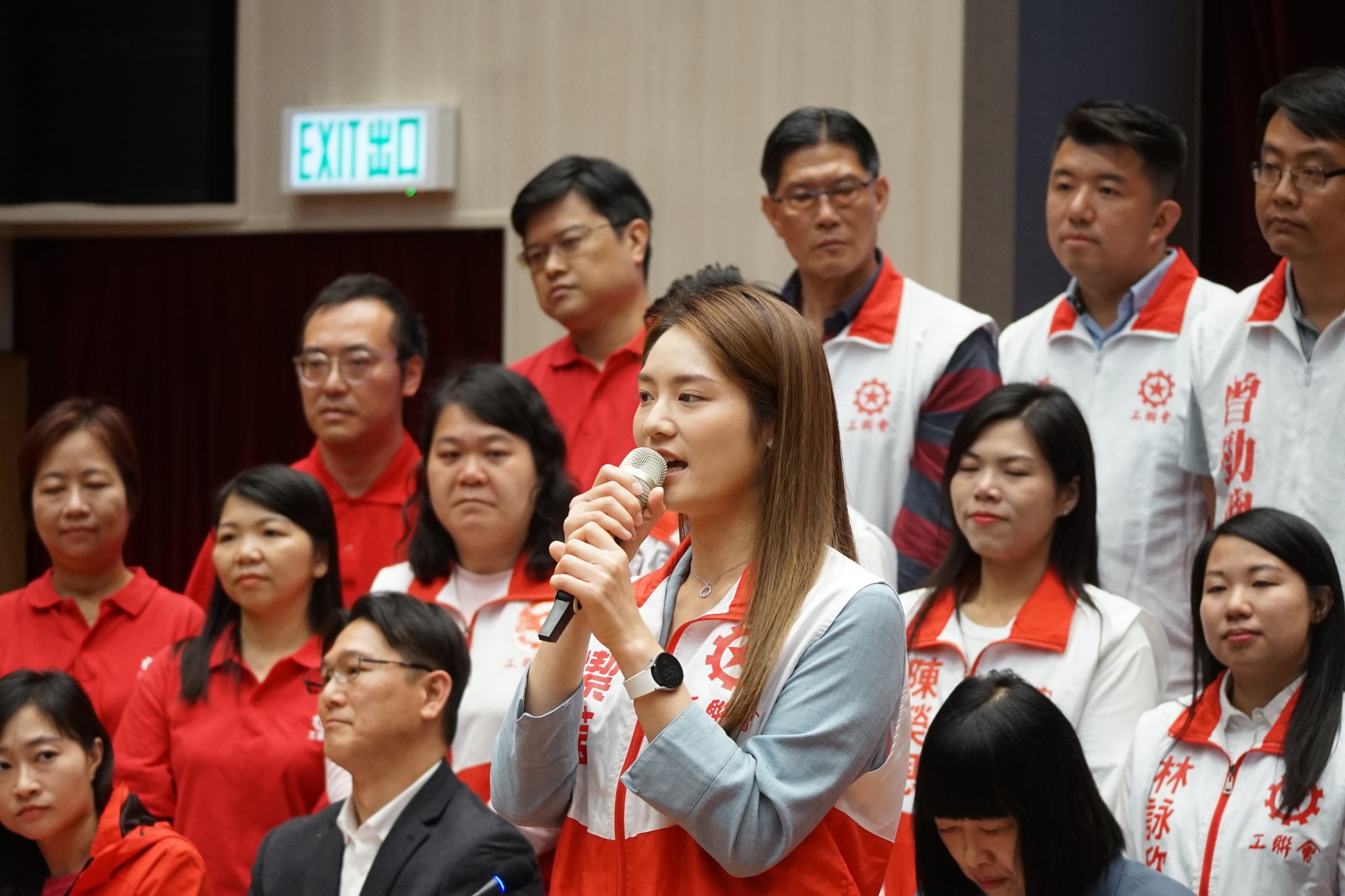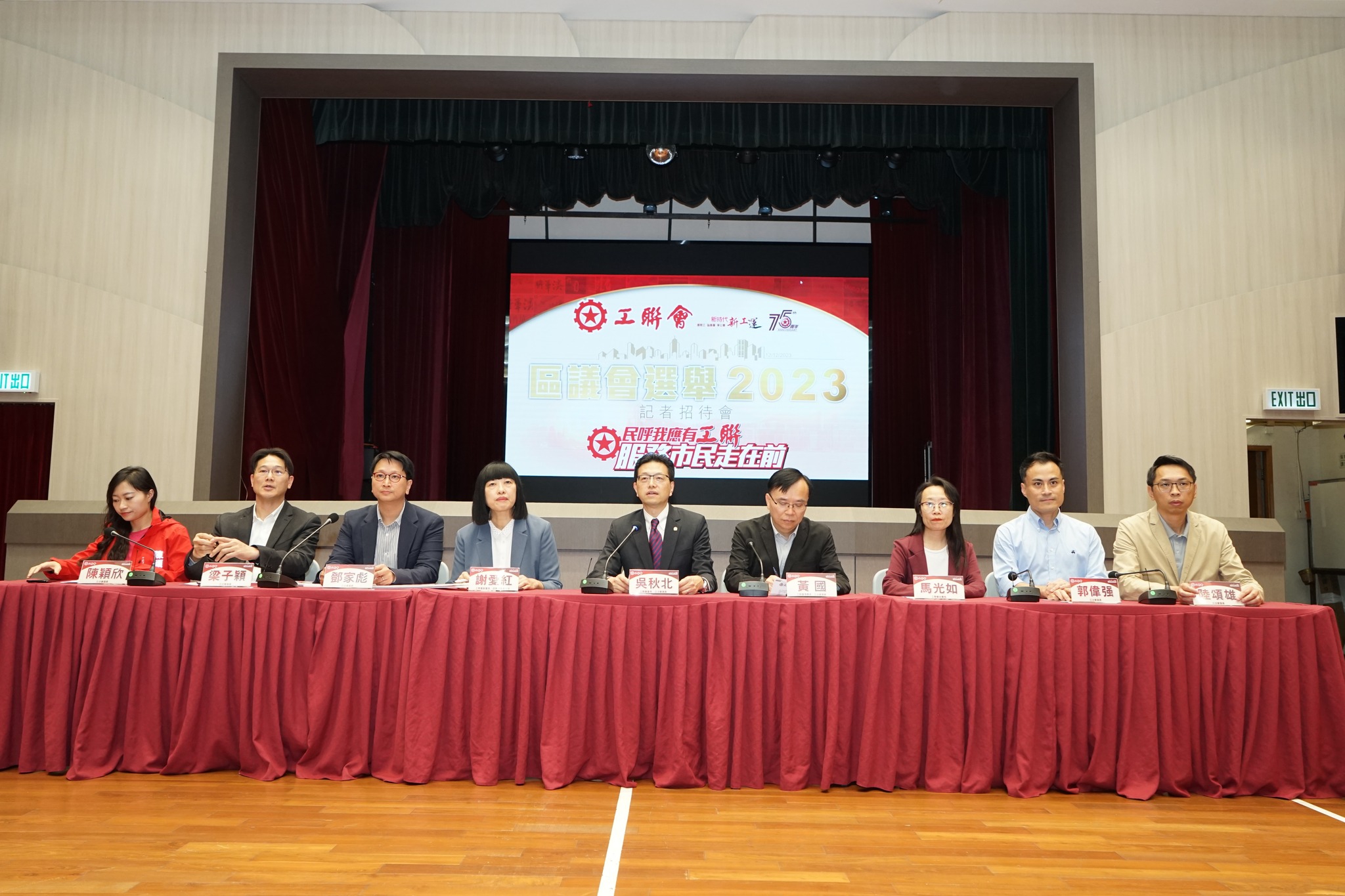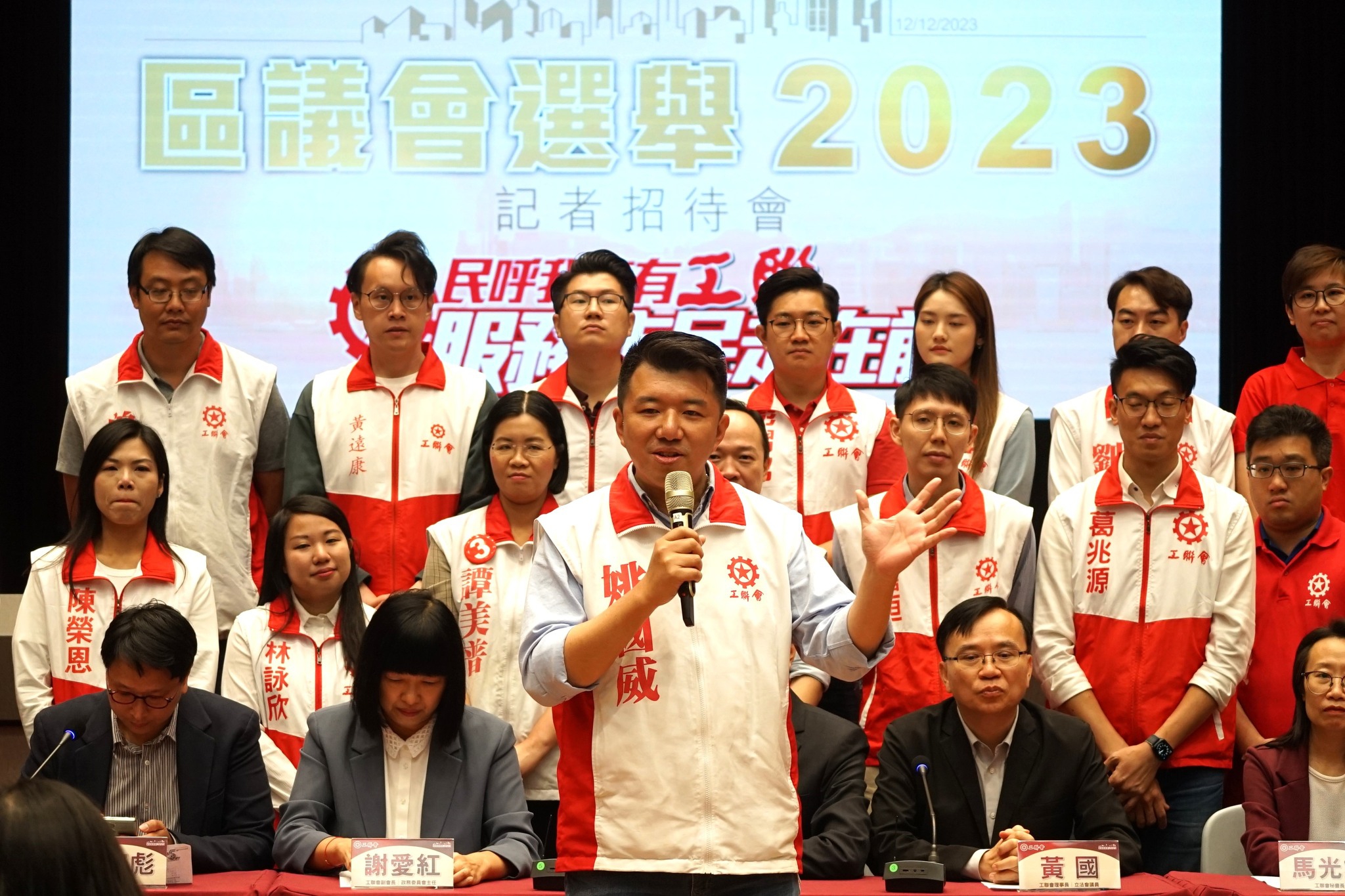 工联会今天(12月12日)举行记者会,工联会会长吴秋北,理事长黄国,副会长兼政务委员会主任谢爱红,秘书长马光如,立法会议员陆颂雄、郭伟强、梁子颖、邓家彪和陈颖欣,以及27位当选人出席。