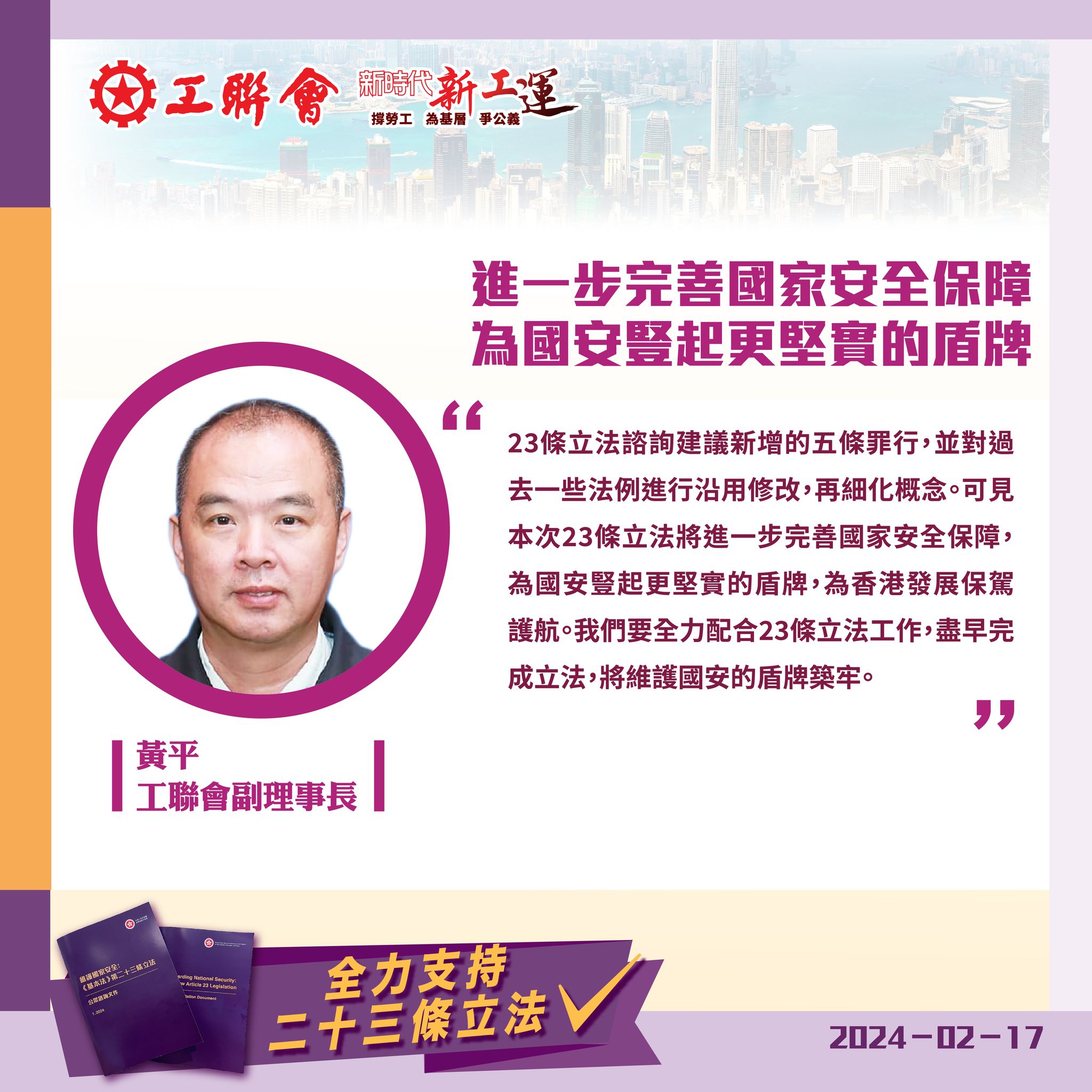 工联会副理事长黄平表示,23条立法谘询建议新增的五条罪行,并对过去一些法例进行沿用修改,再细化概念。可见本次23条立法将进一步完善国家安全保障,为国安竖起更坚实的盾牌,为香港发展保驾护航。我们要全力配合23条立法工作,尽早完成立法,将维护国安的盾牌筑牢。