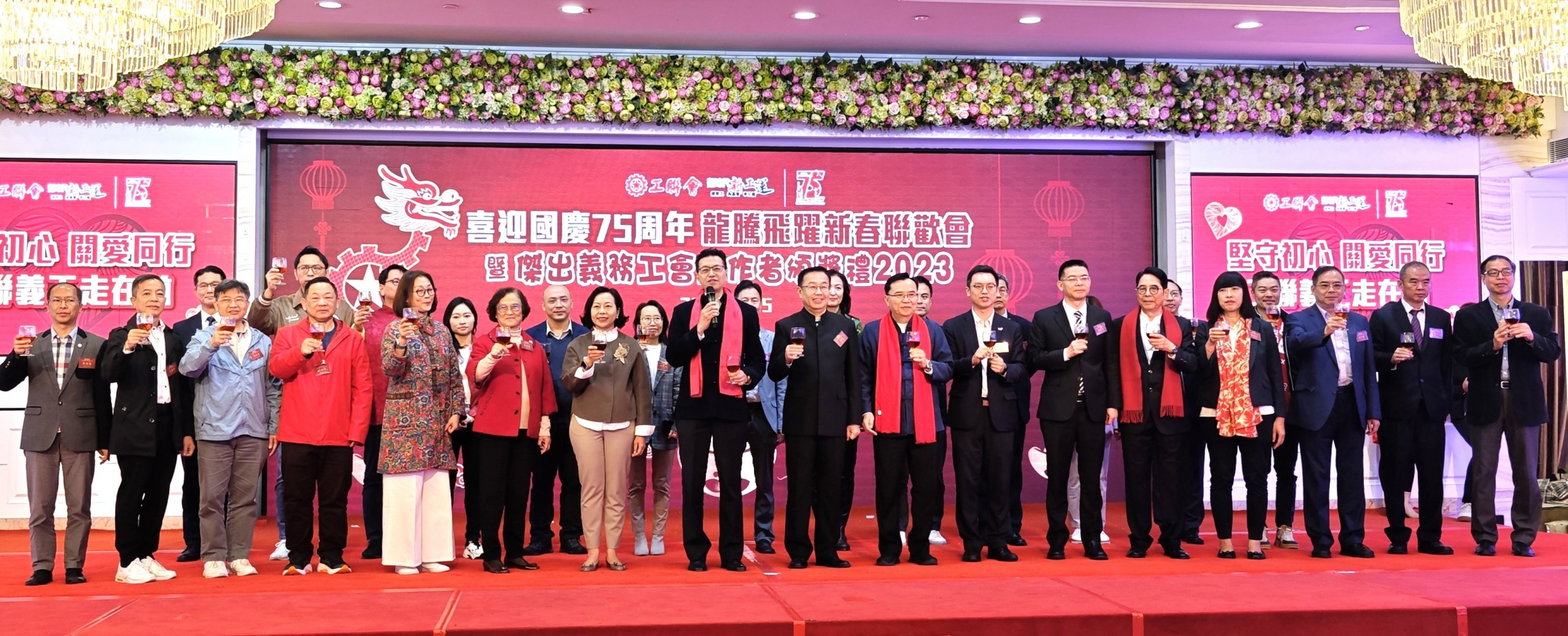 工联会今日(2月25日)举行「喜迎国庆75周年龙腾飞跃新春联欢会暨杰出义务工会工作者颁奖礼2023 」,表扬一群始终坚守为劳工打拼、全心全意为社会无私奉献的义工。应邀出席主礼嘉宾:中联办副主任何靖,民政及青年事务局局长麦美娟,劳工及福利局副局长何启明,连同工联会会长吴秋北、理事长黄国、荣誉会长林淑仪、黄国健等,以及千多名工会理幹事、义工,大家济济一堂,见证获奖义工坚守初心,关爱同行的善举,场面温馨热鬧。