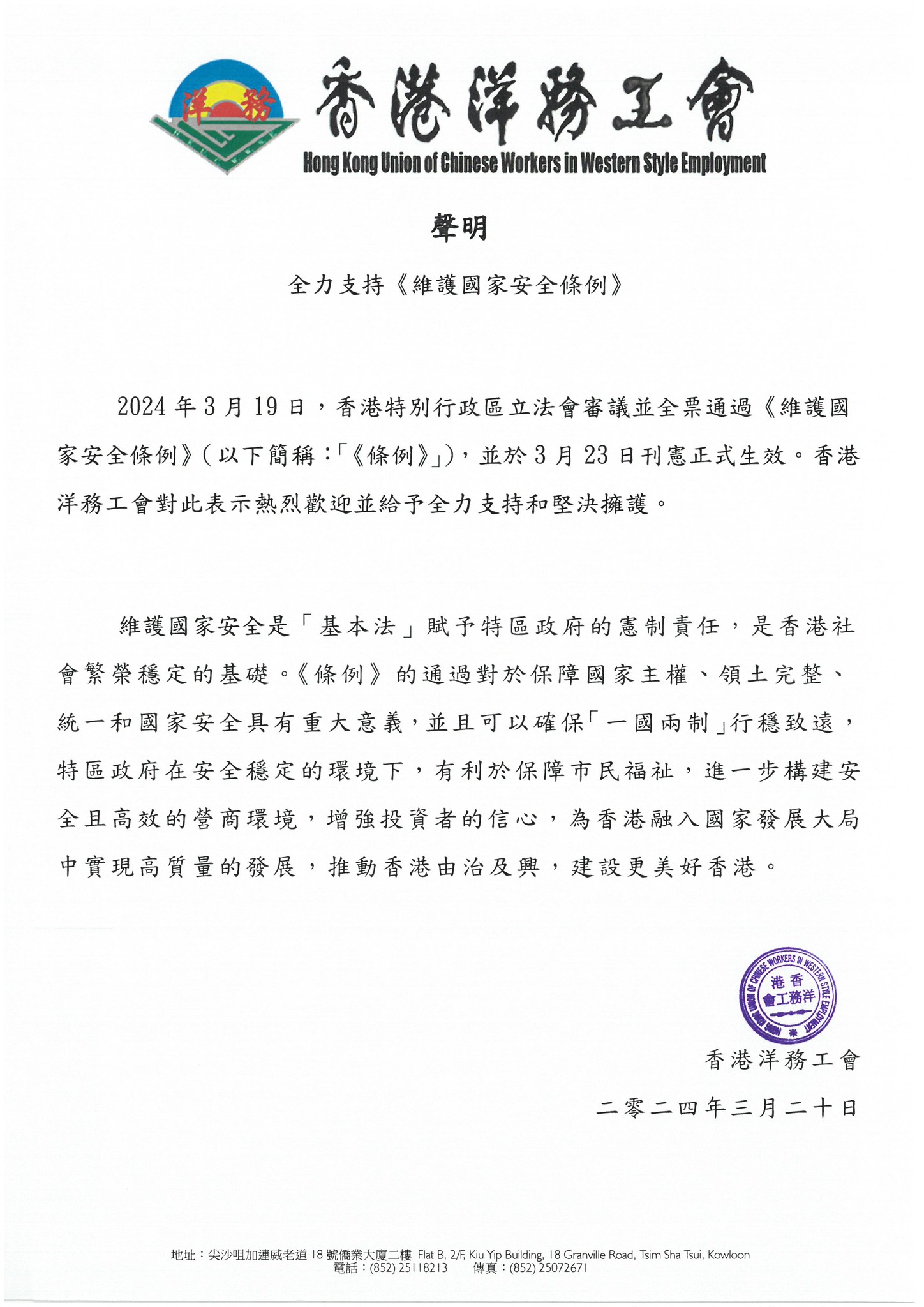 香港洋务工会发表声明: 2024年3月19日,香港特別行政区立法会审议并全票通过《维护国家安全条例》(以下简称:「《条例》」),并于3月23日刊宪正式生效。香港洋务工会对此表示热烈欢迎并给予全力支持和坚决拥护。