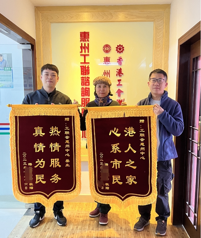 惠州工联谘询服务中心(惠州中心)近日收到港人梅女士的致谢锦旗,感谢惠州中心协助她解决领取内地退休金的问题。梅女士表示:她对惠州中心的服务态度十分满意,感谢中心积极为她着想并解决问题,让她十分安心。