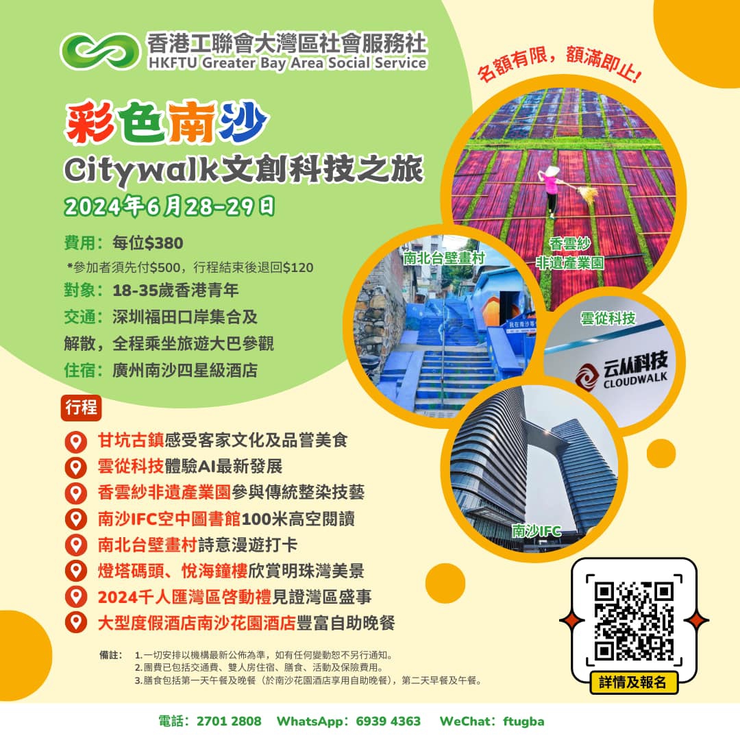 南沙是国家在粤港澳大湾区大力推动的三个重要平台之一,以高新科技发展而闻名。虽然南沙是一个新发展区,但非遗景点也不少,亦不乏青年可前往打卡的精彩地方!跟工联会湾区社去南沙,两日一夜你就可以体验到多面向的「彩色南沙」,Citywalk会到访文创景点,也会探索科技最新发展,快点报名啦!![]()