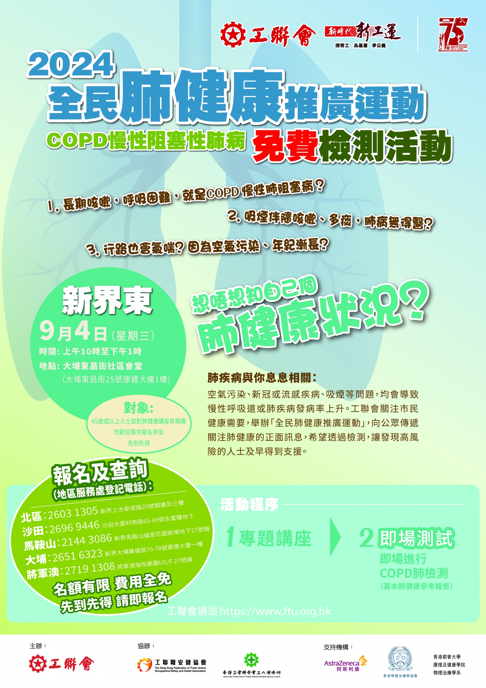 2024「全民肺健康推广运动」是工联会庆祝国庆75周年系列重点活动之一,为关注大众市民健康,将在各区举办多场活动,内容包括专题讲座及免费肺检测,希望唤起市民注意肺健康,早发现、早医治。 新界东 工联会2024「全民肺健康推广运动」活动--新界东专场 日期:2024年9月4日(星期三) 时间:10:00-13:00 地点:大埔东昌街社区会堂 (大埔东昌街25号大埔东昌街康体大楼1楼) 报名及查询到以下地区服务处: 是次肺检测尤其适合45岁以上,有吸烟习惯,长期咳嗽及气喘人士参加。 参与专题讲座后,即场进行肺检测并获取参考报告。活动费用全免,每场名额有限,需预先到地区服务处报名参加。