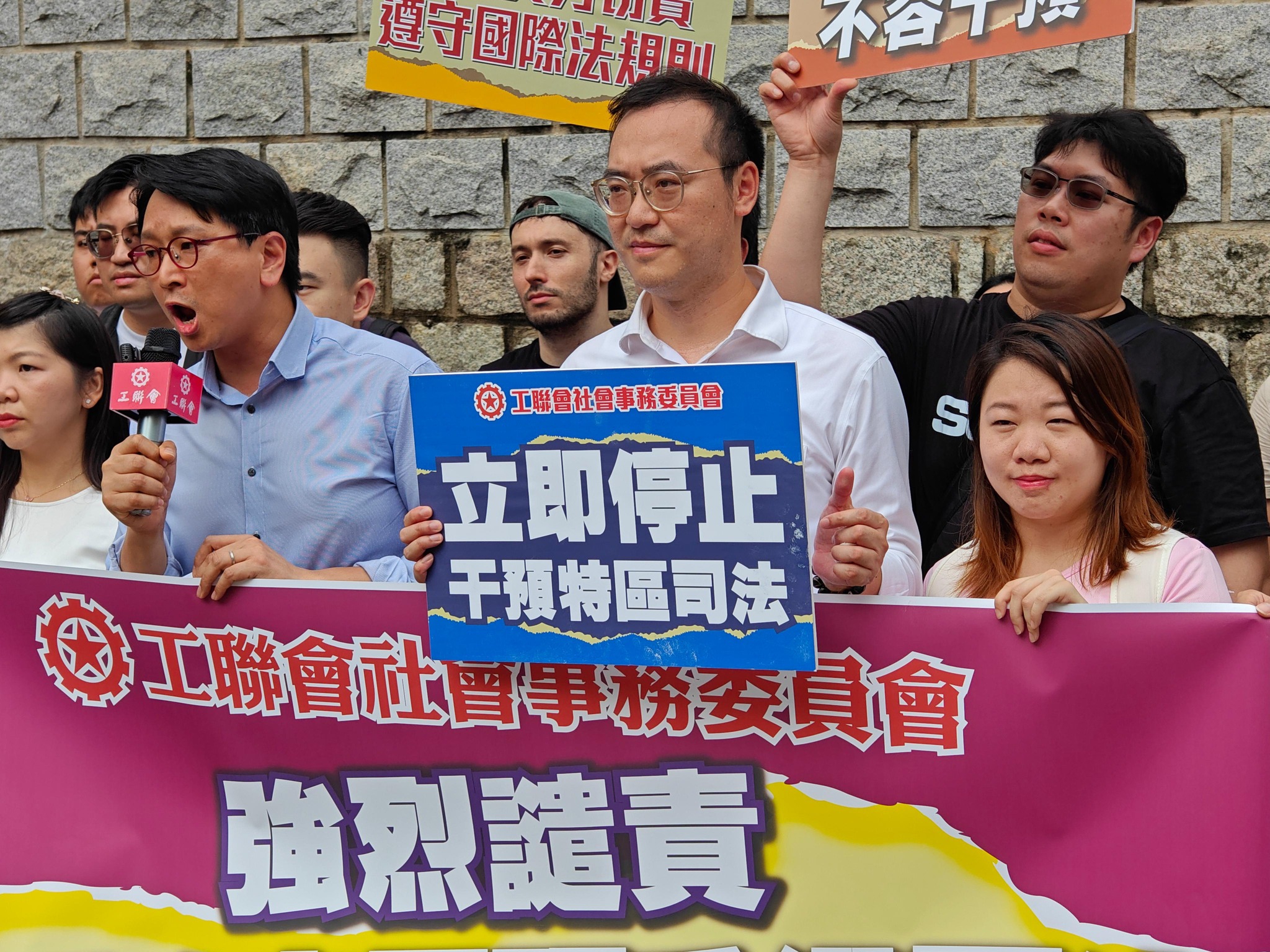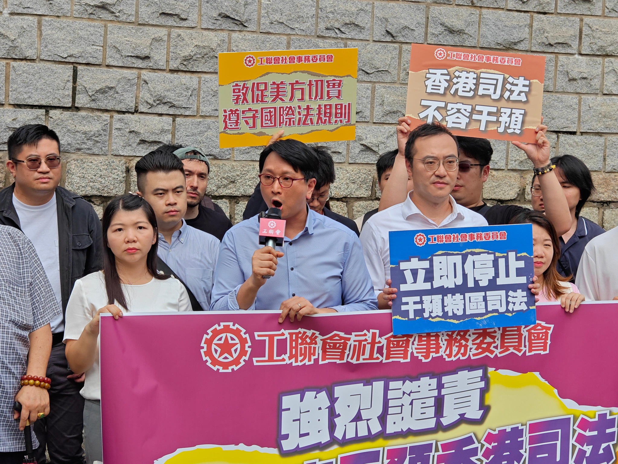 工联会副理事长、立法会议员邓家彪,社会事务委员会代表今天 (9月28日) 到美国驻港澳总领事馆抗议,强烈谴责美国政客恶意抹黑香港特区,干预香港司法,这种行径不仅粗暴践踏法治精神,更暴露出美国政客在人权、法治问题上的双重标准。工联会社会事务委员会指出,美国政客公然粗暴干预了香港内部事务,严重损害了法治和人权精神,工联会予以强烈谴责和抗议,敦促美国政客反躬自省,不要再成为犯罪分子的避风港和安乐窝。