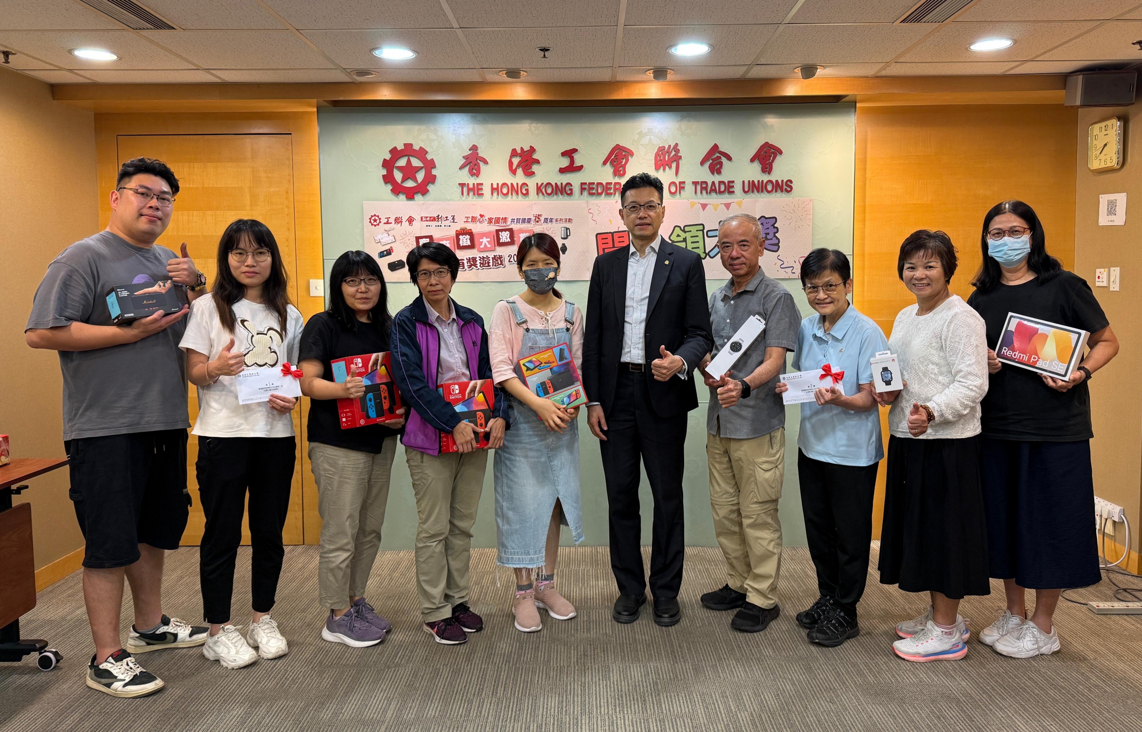 「齐来揿 大激赏」国庆有奖游戏2024经已圆满结束,11月5日进行颁奖。工联会会长吴秋北向大奖得奖会员颁发奖品,获奖者异口同声表示这个APP游戏好玩,接过奖品后也赞口不绝。 是次开心贺国庆75周年的APP游戏,共设150份奖品。大奖包括由香港航空贊助两张机票,其他奖项包括游戏机、蓝牙喇叭、平板电脑、智能手錶、电器及各式礼券等。![]()