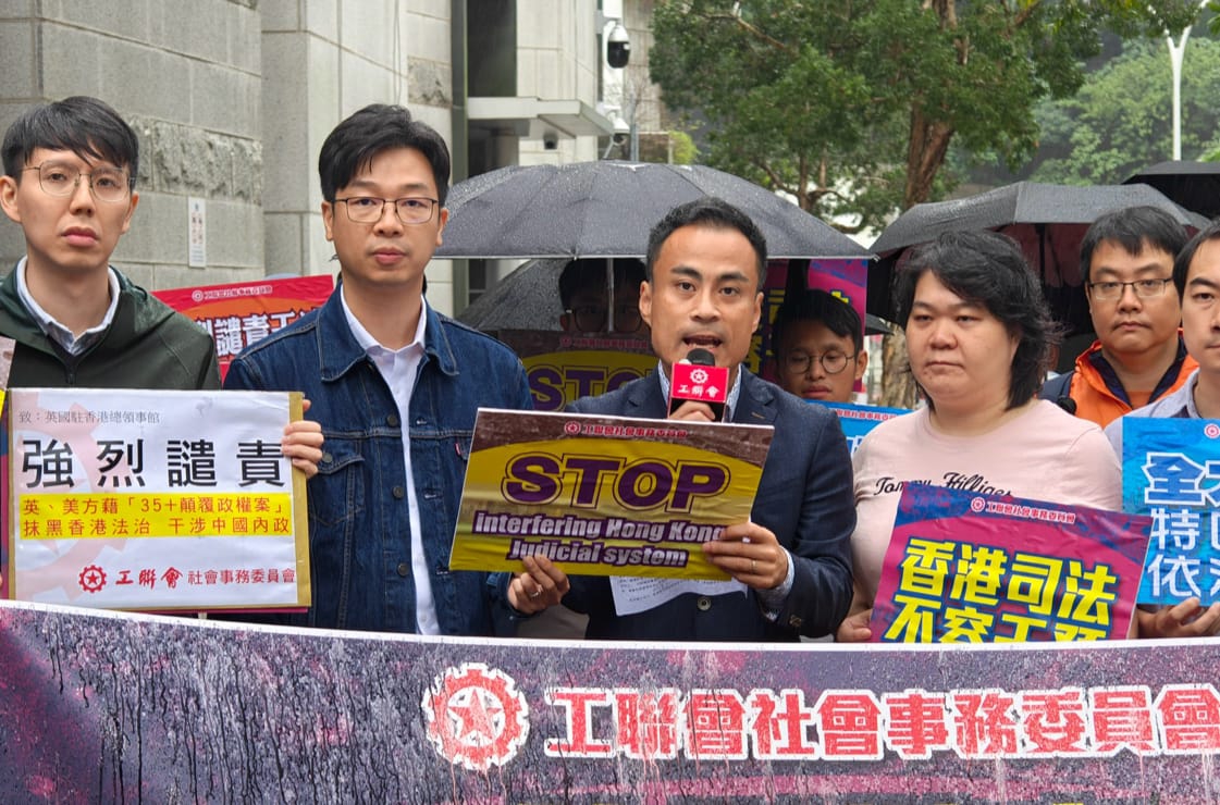 「35+颠覆政权案」判刑,共有47人被控一项串谋颠覆国家政权罪,违反《香港国安法》,但英国外交发展部政务次官、美国驻港总领馆发言人又就香港特区法院依法对「串谋颠覆国家政权罪案」作出的量刑判决横加指责,攻击抹黑香港国安法,干预特区司法,工联会强烈不满和坚决反对,工联会社会事务委员会(社委)于11月20日到英国驻港总领馆进行抗议,强烈谴责干涉中国内政,要求立即停止抹黑。