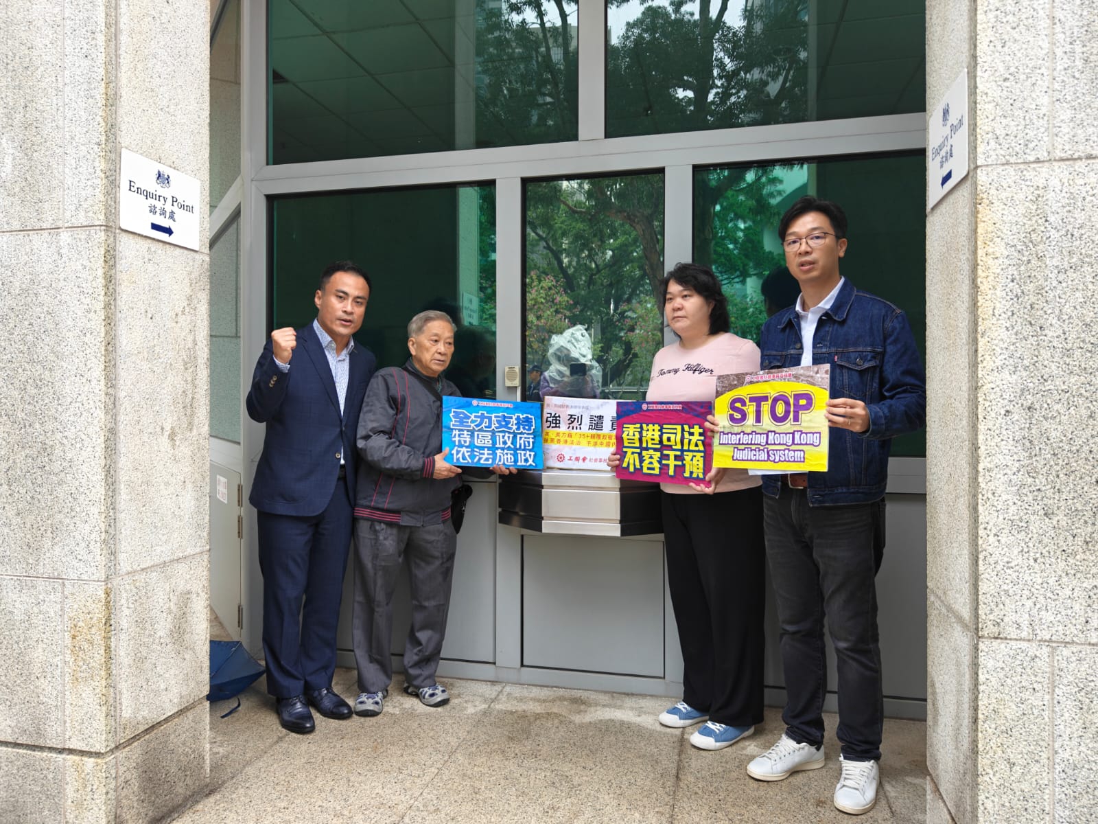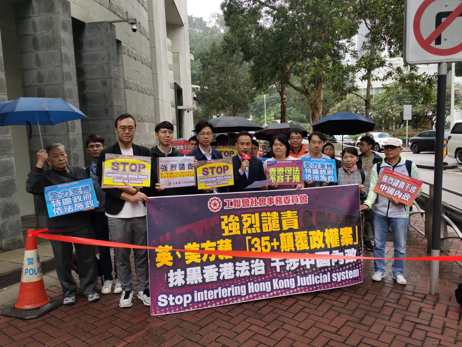 工联会立法会议员郭伟强及社委成员一行人手持「强烈谴责英、美方藉「35+颠覆政权案」抹黑香港法治 干涉中国内政」的横额,又高叫「香港司法 不容干预」、「全力支持 特区政府依法施政」等口号,要求有关人士停止干预香港司法制度的卑劣行径。