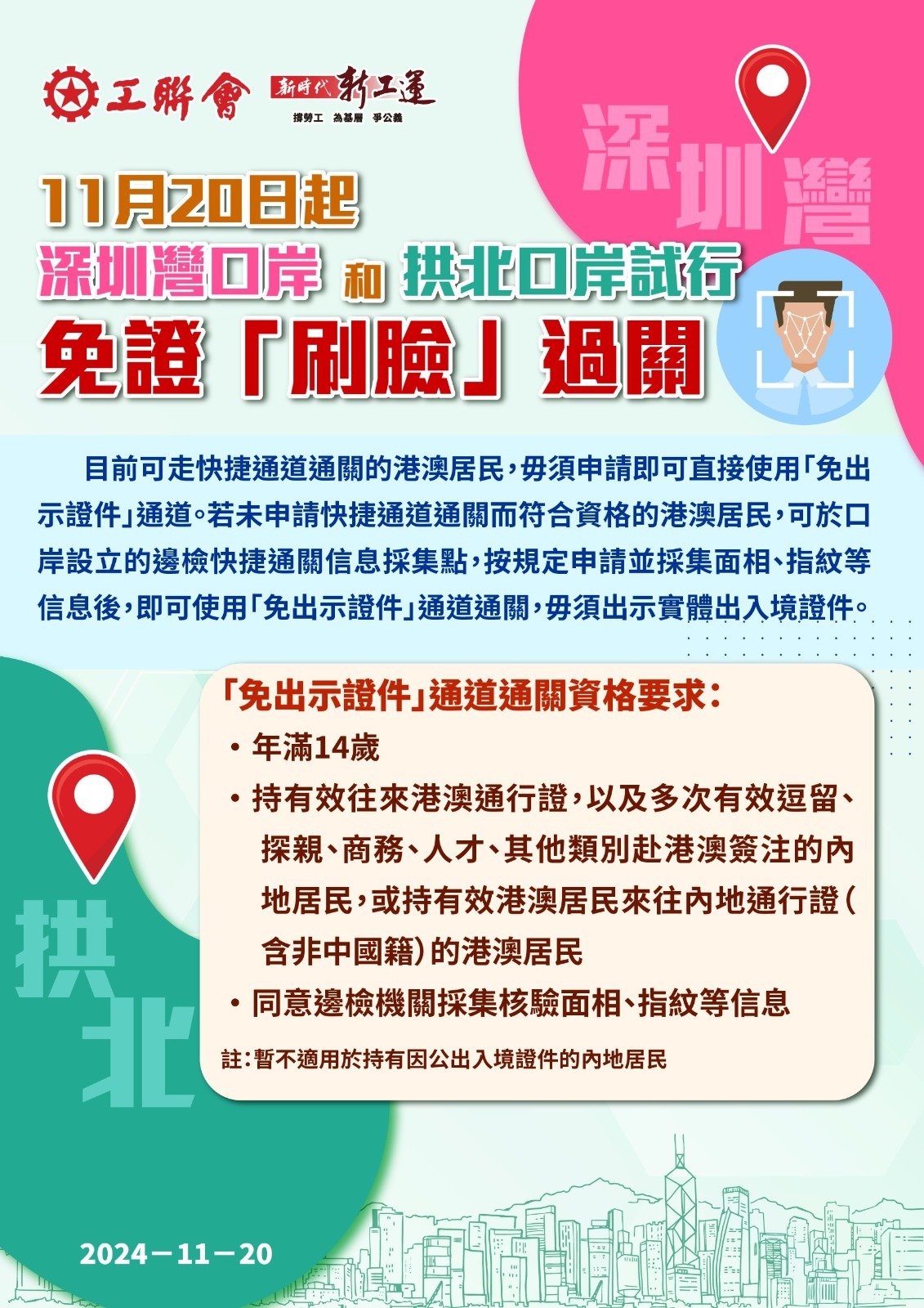 2024-11-20 深圳湾及拱北口岸11月20日起试行免出示证件过关 以「刷脸」取代「刷证」