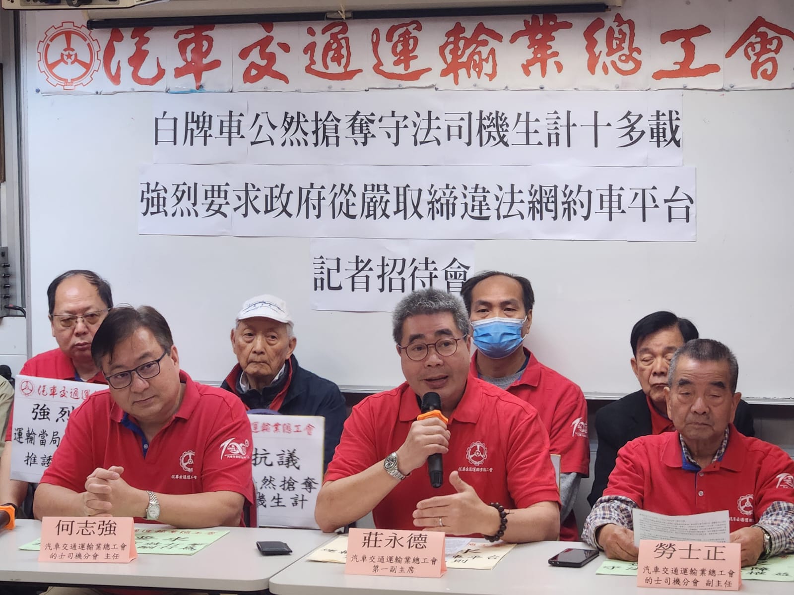 在运输当局如斯不济之下,UBER便不失时机和变本加厉地营运白牌车,使用各种花样来抢夺守法司机的营运空间,把的士行业运作搞得乌烟瘴气的同时,也仿若视法律如无物,结果进一步激怒前缐的士司机,迫使一些司机以「放蛇」方式搜集白牌车非法载客取酬的证据及报警求助。可惜的是,这些事件反在运输当局的有为操作和掩盖之下,不了了之。在这种运输当局懒政无为致使白牌车横行的乱象下,TADA和高德近期便伺机高调地表明「开拓」香港非法网约车市场,而运输当局也好像灵魂出窍,呆立当场,沒有採取有效打击行动,因而引起广大前缐司机的强烈不满。对此,汽车交通运输业总工会于今日举行记者招待会,提出工会的立场和要求,保障守法司机的合理营运,并要求运输当局立即和果断地採取行动,取缔相关白牌车营运平台。