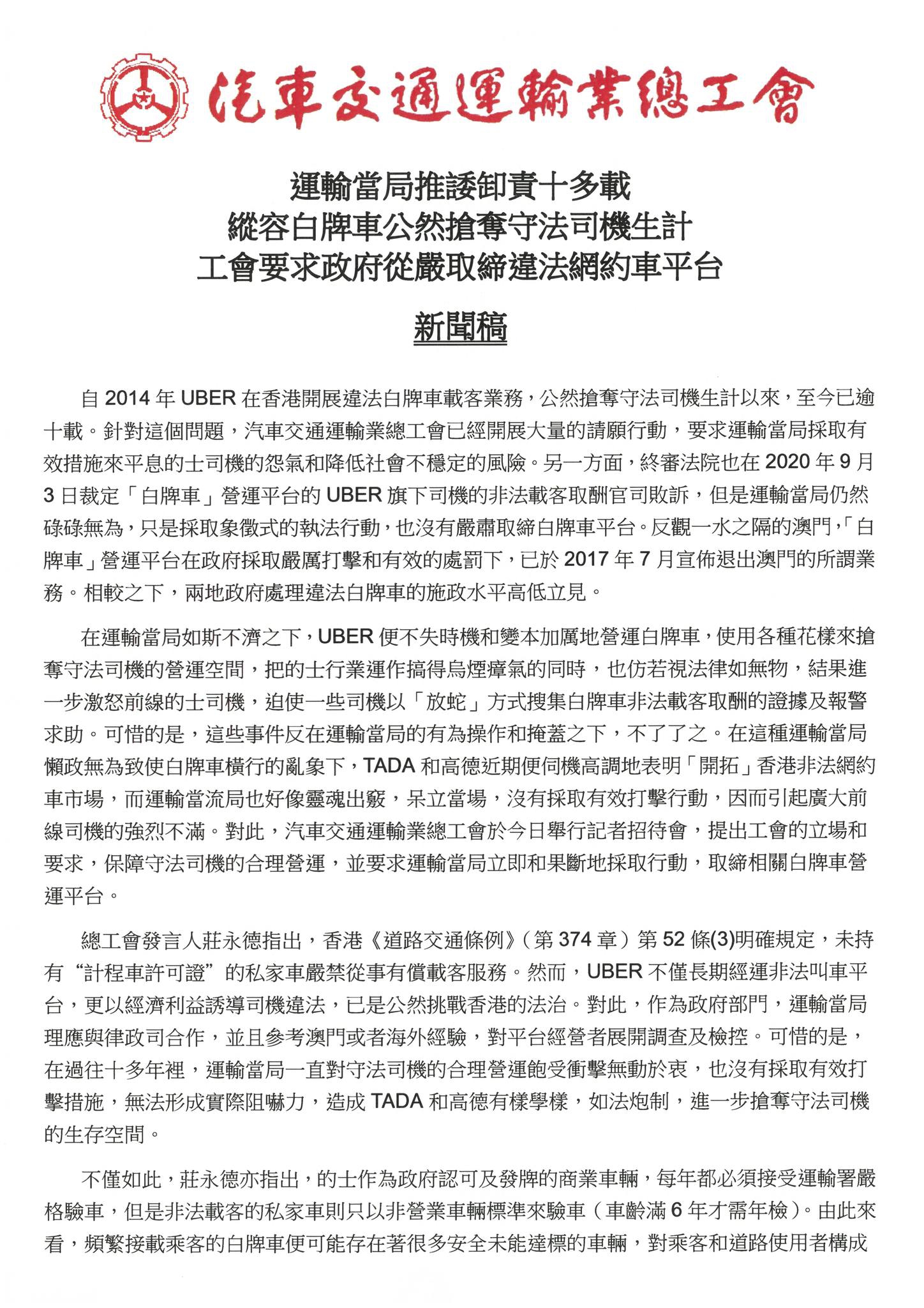 自2014年UBER在香港开展违法白牌车载客业务,公然抢夺守法司机生计以来,至今已逾十载。针对这个问题,汽车交通运输业总工会已进行多次请愿行动,要求运输当局採取有效措施来平息的士司机的怨气和降低社会不稳定的风险。另一方面,终审法院也在2020年9月3日裁定「白牌车」营运平台的UBER旗下司机的非法载客取酬官司败诉,但是运输当局仍然碌碌无为,只是採取象徵式的执法行动,也沒有严肃取缔白牌车平台。反观一水之隔的澳门,「白牌车」营运平台在政府採取严厉打击和有效的处罚下,已于2017年7月宣佈退出澳门的所谓业务。相较之下,两地政府处理违法白牌车的施政水平高低立见。
