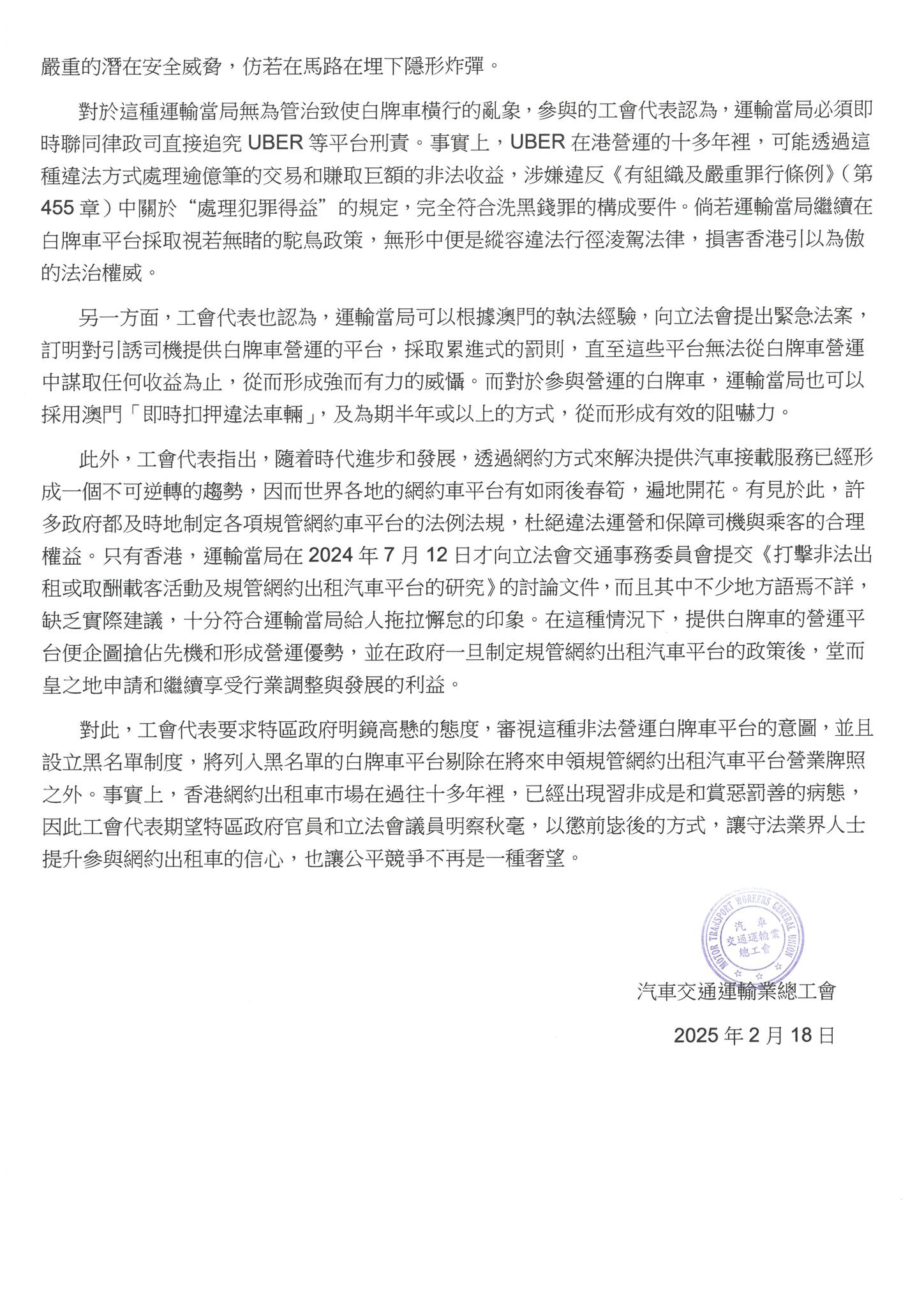 2025-02-18 运输当局推诿卸责十多载 纵容白牌车公然抢夺守法司机生计 汽车交通运输业总工会要求政府从严取缔违法网约车平台